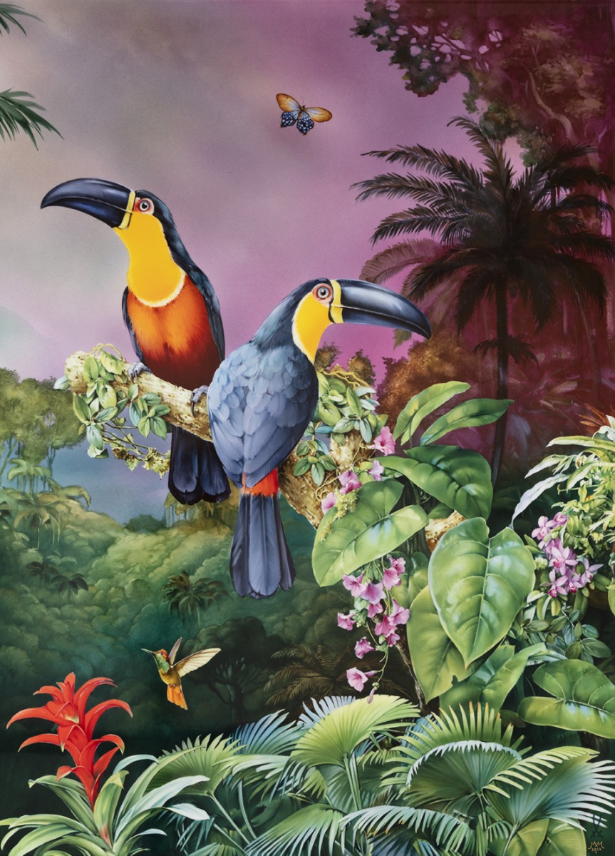 Die beeindruckenden Wandbilder unserer „Exklusiv-Kollektion“ sind eine künstlerische Reise in das tiefe Grün des Regenwaldes. MEISSEN Designerin Lena Hensel kombinierte faszinierende Motive aus dem brasilianischen Amazonas und vereinte diese zu einem wahren Meisterwerk. Bei ihrer Suche stieß sie auf den Hyazinthara, der als eines der kultigsten Symbole der brasilianischen Artenvielfalt gilt. In intensiven Farben ließ sie in naturalistischem Malstil und mit verschiedenen, sehr aufwendigen Maltechniken den tropischen Lebensraum dieses faszinierenden Vogels entstehen. Inmitten der unzähligen Grüntöne des Regenwaldes, umrahmt von üppigen Palmen und allerlei anderen exotischen Pflanzen, dominieren zwei große Exemplare des Hyazintharas die Szenerie. Die intelligenten und äußerst geselligen Tiere besitzen eine beeindruckende Fähigkeit: Sie können lernen, Geräusche wie die menschliche Stimme oder Töne anderer Tiere zu imitieren.