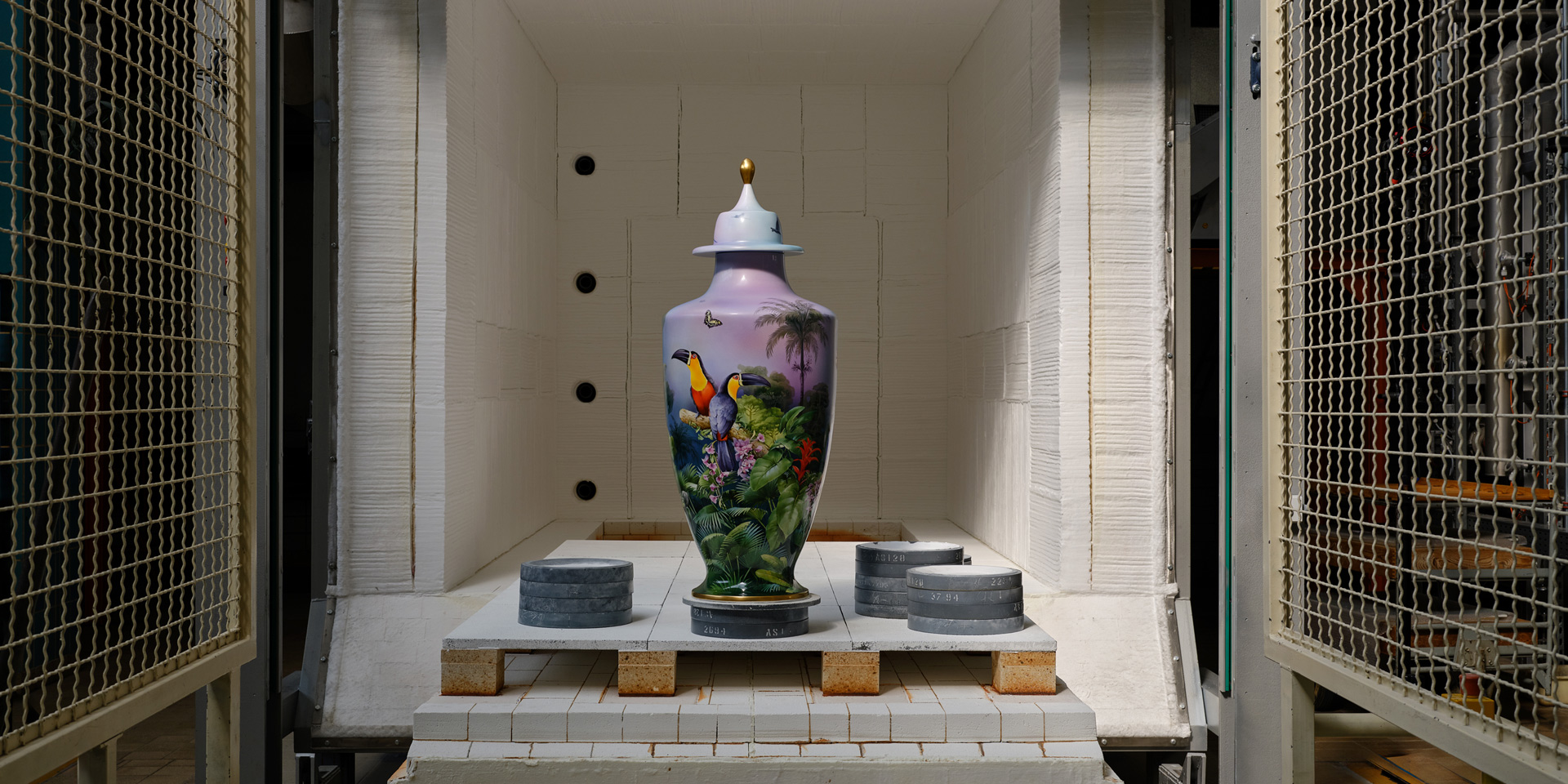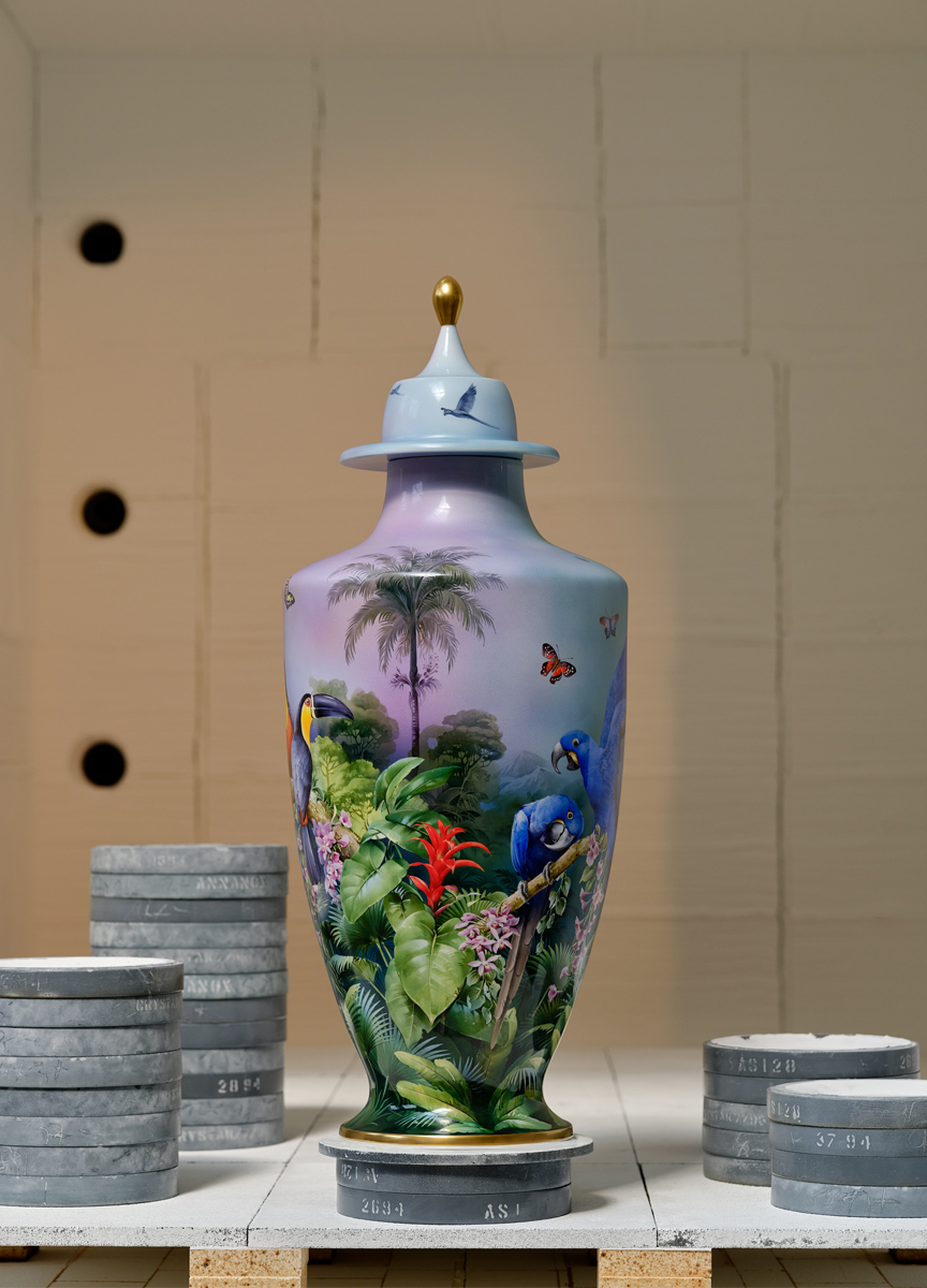 Die Meissener Porzellanmalerin Michaela Hummitzsch umhüllte eine Vase der chinesischen Künstlerin Zhuoyu Hou mit der faszinierenden Welt des dichten, tropischen Regenwaldes. In intensiven Farben, naturalistischem Malstil und mit verschiedenen, sehr aufwendigen Maltechniken sehen wir ikonische Tiere der Region wie den Hyazinthara, den Dottertukan oder den bärtigen Kaiserschnurrbarttamarin. Die große Gefäßfläche der Vase diente Lena Hensel als perfekte Bühne, auf der sie das exotische Naturschauspiel zum Leben erwecken konnte. Doch die herausragende Größe der Vase stellte nicht nur die Porzellanmalerin, sondern auch alle Mitarbeiter in der Weißfertigung vor eine kunsthandwerkliche Herausforderung. Mit 90 cm ist sie das Maximum, was die Manufakturisten im Dekorofen umsetzen können, bei der Dekoration ist ein extra gefertigtes Malgestell erforderlich.
