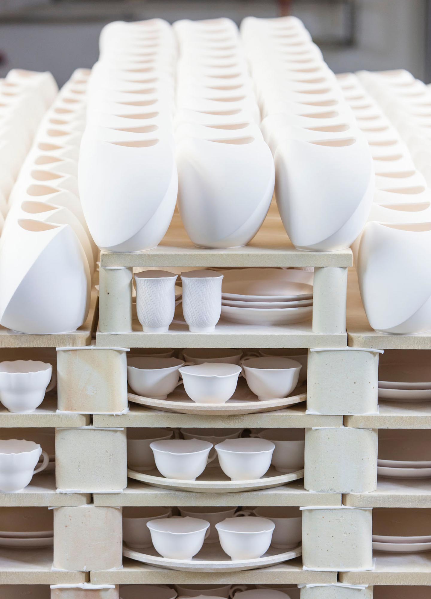 Einmalig gebrannte Porzellane erhalten in der rosa Tauchglasur – oder Figuren durch Besprühen – ihre Veredelung. Denn beim anschließenden Glattbrand von bis zu 1.400° C verschmilzt die Glasur mit dem porösen Porzellan, das beim Brennen über bis zu sechs Tagen um etwa ein Sechstel schrumpft. Nur wenn Massezusammensetzung und Brenntechnik optimal aufeinander abgestimmt sind, lassen sich die besondere Härte und der hohe Weiß-Grad echten Meissener Porzellans erzielen.