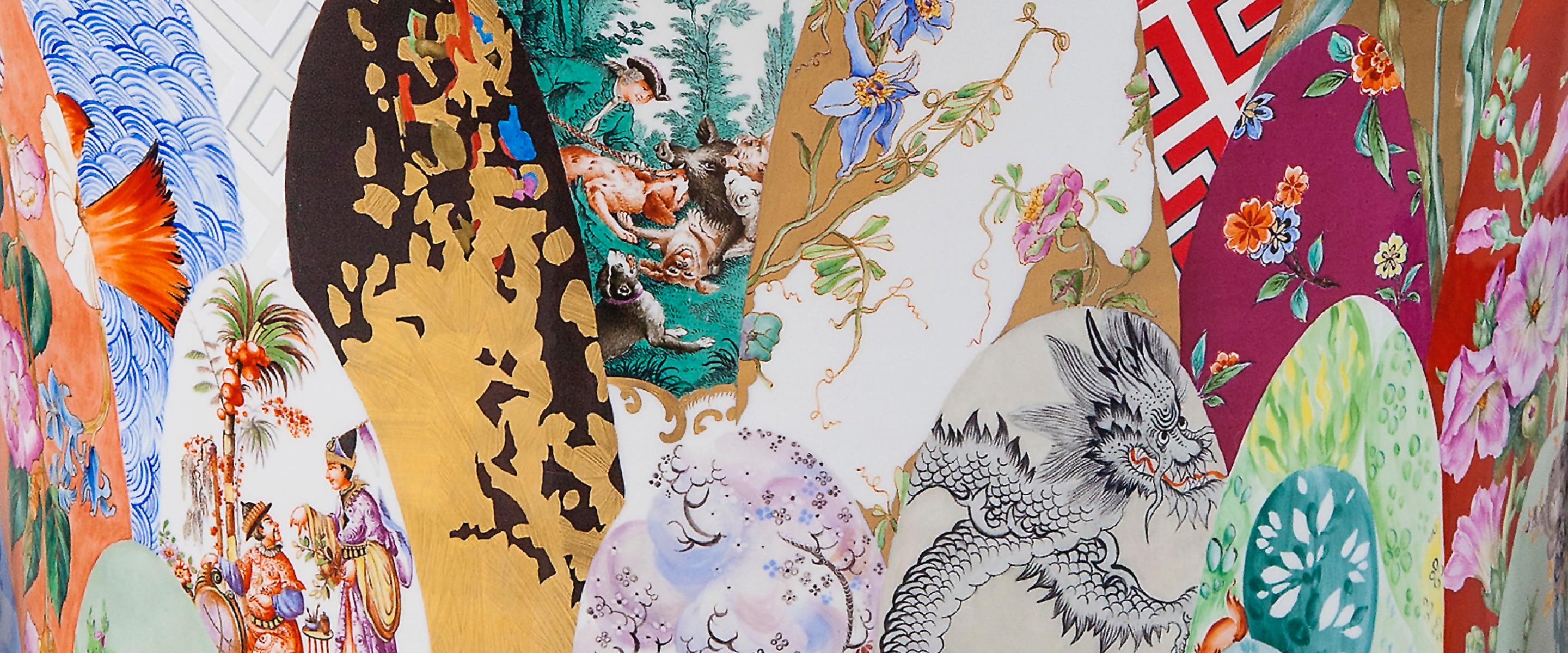 Noble BlueInspiriert von damals überwiegend blau gestalteten ostasiatischen Porzellanen entsteht 1731 in Meissen das weltbekannte „Zwiebelmuster”, der ikonischste Blaudekor der Porzellangeschichte. Tatsächlich stellt der Dekor keine Zwiebeln dar, sondern zeigt in Anlehnung an seine Vorbilder Pfirsich und Melone auf dem Tellerrand sowie Bambusstock und die zarten Blüten der Chrysantheme in der Mitte. In “Noble Blue” findet das „Zwiebelmuster” eine neue Gestalt, die der Opulenz des Originaldekors moderne Leichtigkeit entgegensetzt. Charakteristisch für den Dekor ist die Verwendung des manufaktureigenen Kobaltblaus. Motivische Details in leuchtendem Rot sowie filigrane Goldveredelungen ergänzen schließlich die Farbpalette von „Noble Blue“ und inszenieren das Blau in komplementären Kontrasten.