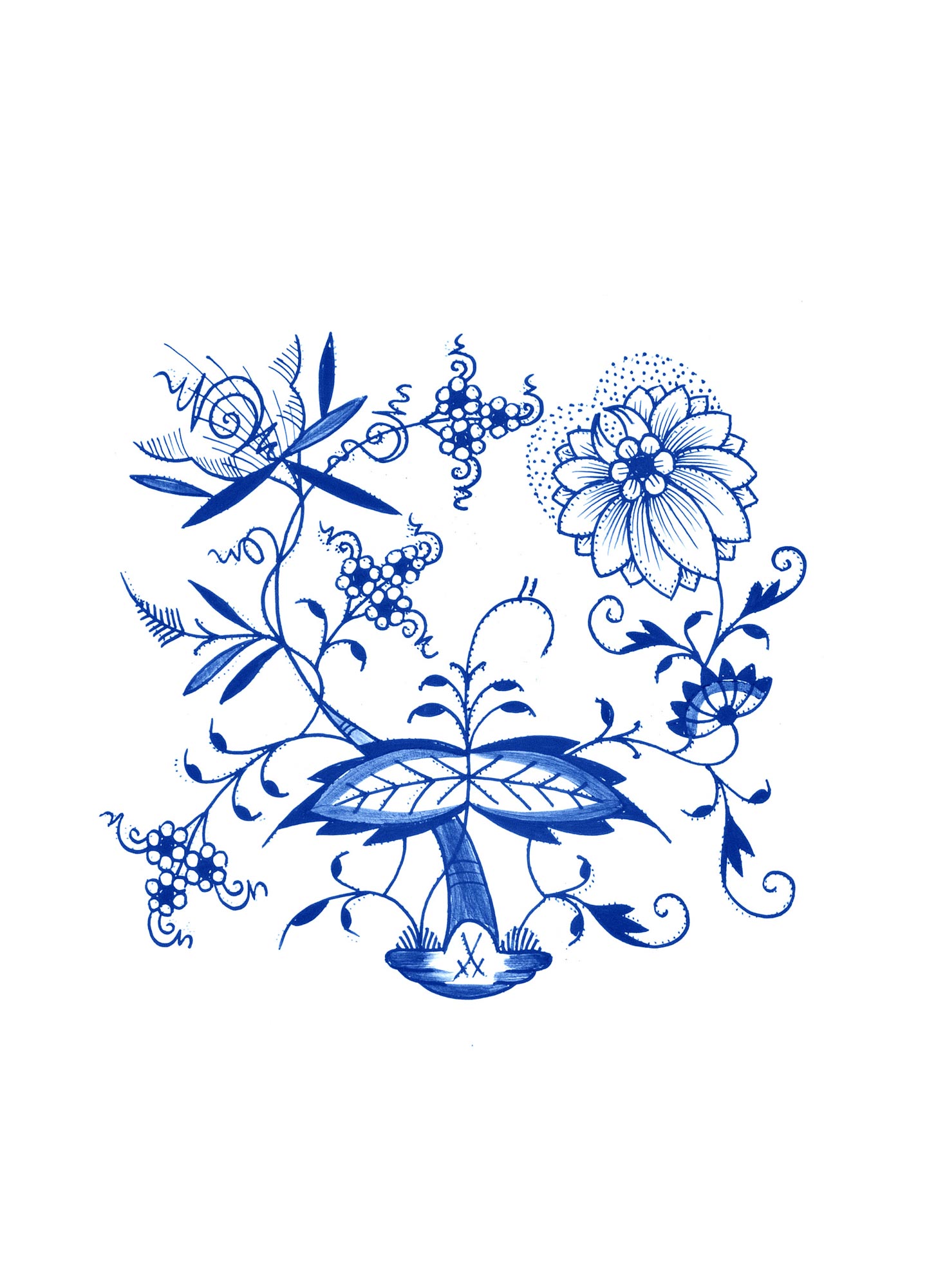Zwiebelmuster StyleIm Jahr 2004 erfährt das historische „Zwiebelmuster“ eine zeitgemäße Überarbeitung. Anstatt der gleichmäßig vollflächigen Bemalung wird die Crysanthemenblüte asymmetrisch auf dem Tellerspiegel angeordnet. Der Bambusstamm mit Ranken, zarten Blüten und Blättern sowie das Doppelblatt vom klassischen Dekor sind geblieben. Hingegen sind die Früchte vom Tellerrand verschwunden und der Dekor erscheint aufgelockert und das strahlende Weiß des Porzellans wird stärker betont. Auch auf der Tasse finden sich die Chrysantheme und der Bambusstamm mit Ranken als eine reduzierte, weniger kompakte Bemalung wieder - Umgeben von zarten Ranken scheint der Bambus nahezu aus der dieser herauszuwachsen. Die Früchte sind auch hier verschwunden. Nur eine Zwiebel auf der Untertasse erinnert noch an ihre Vorgänger.