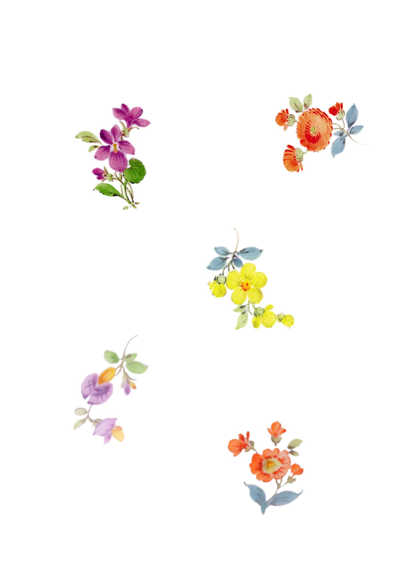 Gestreute Blümchen„Gestreute Blümchen“ gehört zu den beliebtesten Dekoren der Manufaktur Meissen. Anfang des 19. Jahrhunderts entstanden, ist er eine typische Schöpfung des Biedermeier. Blüten und Blumen sollen in ihrer natürlichen Schönheit gezeigt werden und sich damit erstmals von den ‘indianischen’ nach ostasiatischen Vorbildern absetzen. Als besondere Spielart der Manierblumenmalerei, besitzt der Meissener Dekor eigene Merkmale. Eine vergrößerte Mittelblume wird von mehreren vielgestaltig variierten kleineren Blumen umstreut. Die Porzellanmaler können hierfür auf drei Dutzend Blumenmotive zurückgreifen – jedes mit eigener Symbolik, die zu Zeiten des Biedermeier verwendet wird, um Gedanken und Empfindungen auszudrücken. En Detail per Hand auf Porzellan gemalt, verleihen die „Gestreuten Blümchen“ eine besondere Lebendigkeit und innere Symbolik. -