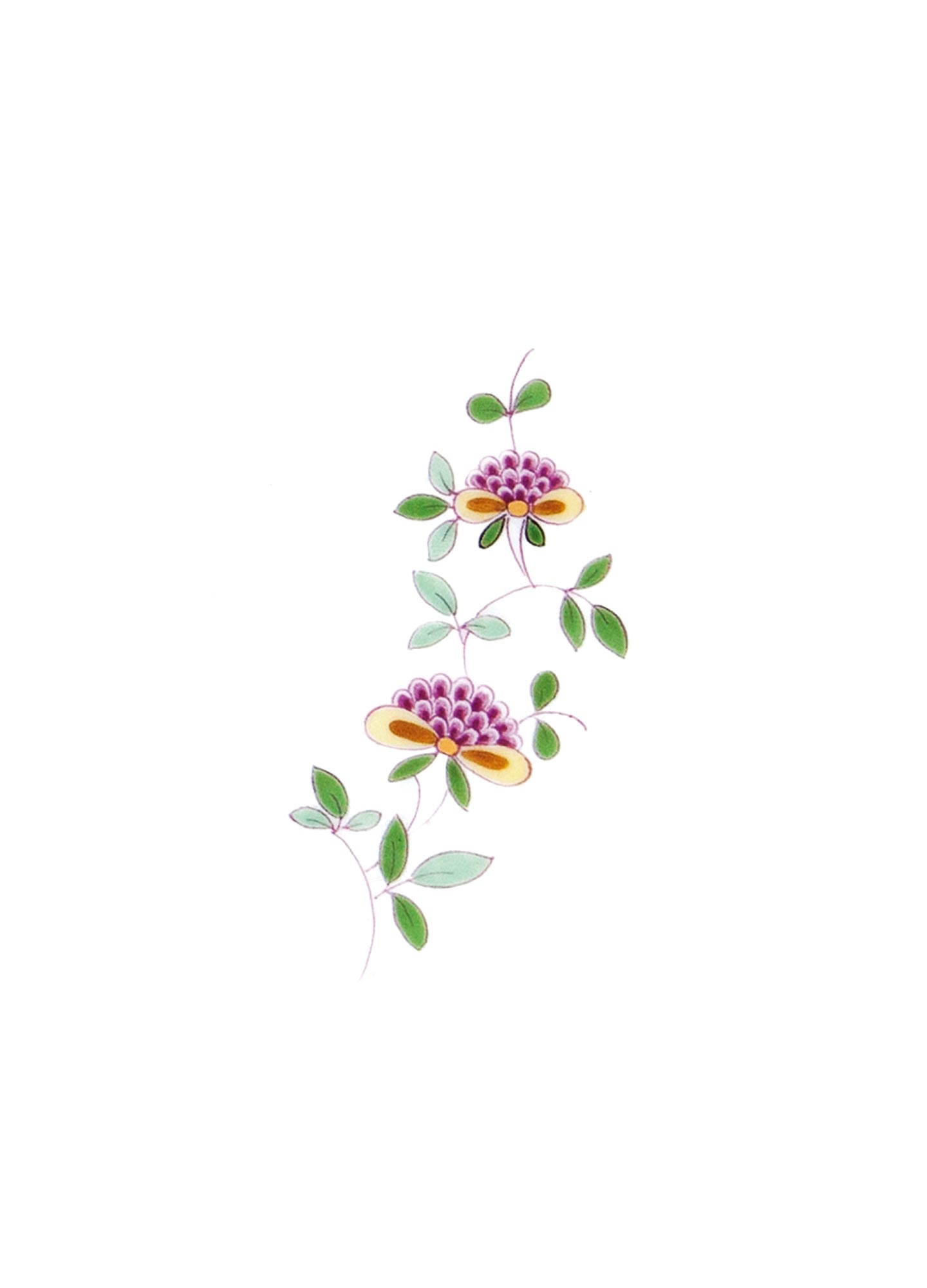 Indische BlumenzweigeDie „Indischen Blumenzweige“ gehören zu den ältesten Dekoren der Manufaktur Meissen. Sie werden bereits 1720 zur Zier von Tafelgeschirr und Vasen verwendet. Der „indianischen“ Blumenmalerei nach ostasiatischen Vorbildern nachempfunden, stecken sie voller Symbolkraft. In ihr nimmt der Lotus als Zeichen der Reinheit und Erleuchtung eine besondere Stellung ein. Aus schlammigem Grund gewachsen, erstrahlt er rein und unbefleckt in voller Blüte – ein Sinnbild, dessen metaphorischer Gehalt ebenso auf das Meissener Porzellan übertragen werden könnte. -