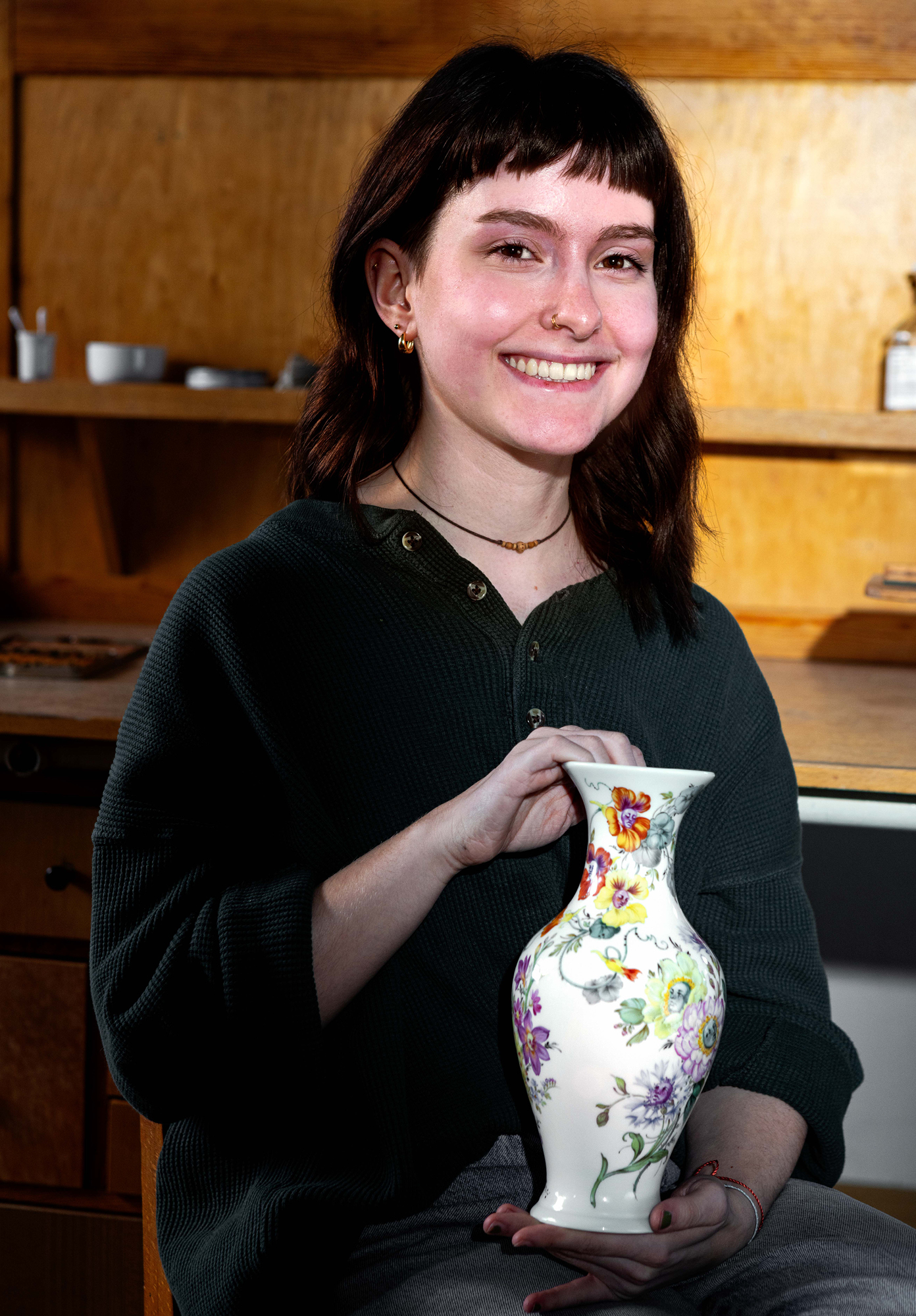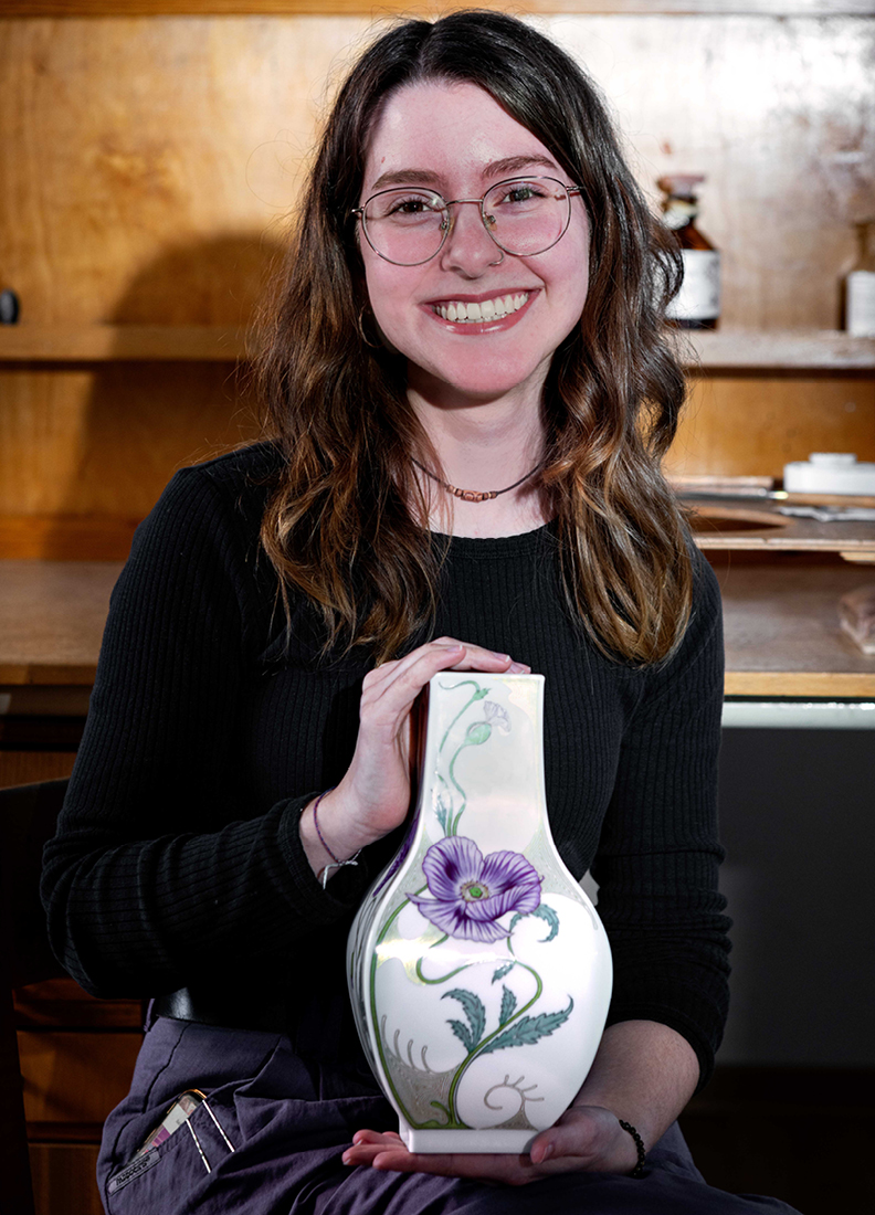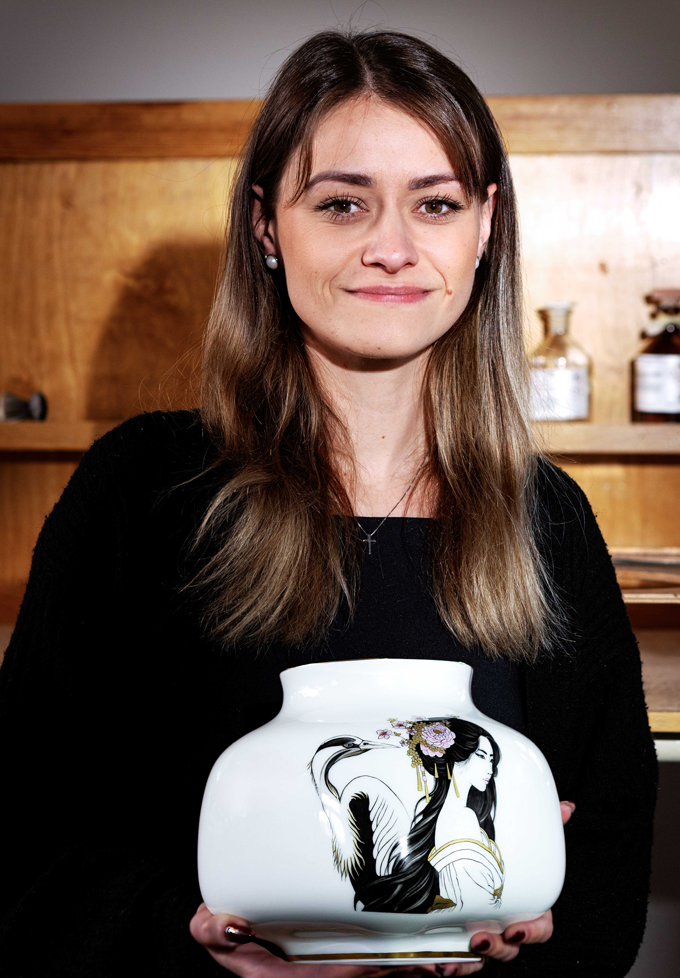 In aufwendiger Limogesmalerei gelingt der Porzellanmalerin Lidija Schrenk ein zarter Dekor auf einer kostbaren Vasenform des Meistermodelleurs Ernst August Leuteritz.