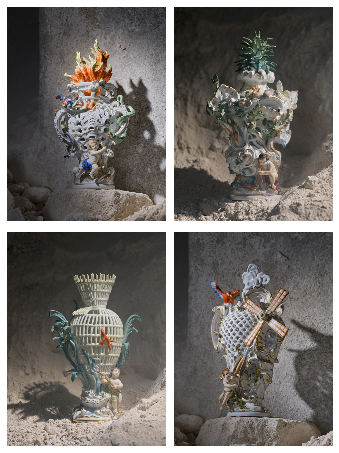 Bei der Neuauflage der „kleinen“ Elementevasen, wurden die MEISSEN Manufakturisten allerdings gleich mit mehreren kunsthandwerklichen Herausforderungen konfrontiert. So galt es bei der Vase „Luft“ 60 einzelne Formen zusammenzusetzen, das Windmühlenrads anzupassen und den Blasebalg passgenau anzufügen. Die Vase „Wasser“ besteht aus 54 einzelnen Formen und insbesondere das Einpassen und Ansetzen der filigranen, netzartigen Reuse erfordert viel Fingerspitzengefühl. Die aus 32 einzelnen Formen bestehenden Vase „Erde“ sticht durch die Agave am Flaschenhals heraus, welche zahlreiche einzelne Blätter trägt, die modelliert, zusammengefügt und schließlich staffiert werden müssen. Die Vase „Feuer“ zählt sogar ganze 85 einzelne Formen. Gemeinsam haben alle vier Vasen die handwerkliche Schwierigkeit in der Herangehensweise des Durchbruchs – wann ist der richtige Zeitpunkt, um ihn auszuschneiden, wann müssen Drachen oder andere Dekorationen angebracht werden? Doch all die Mühen haben sich gelohnt und so konnte ein Werk europäischer Porzellankunst mit langer Geschichte wiederentstehen.