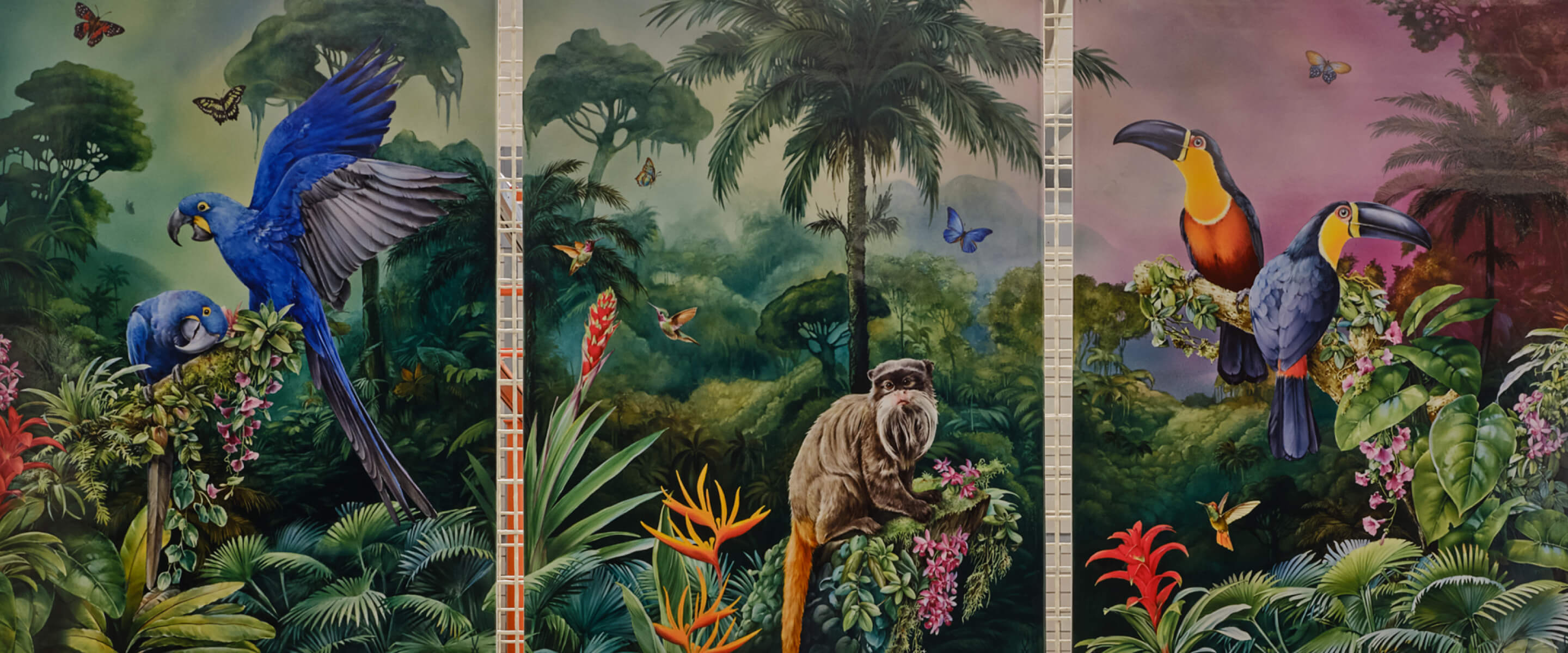 Dazu gesellt sich der Kaiserschnurrbarttamarin, benannt nach Kaiser Wilhelm II. von Deutschland, der für seinen sehr markanten Schnurrbart berühmt war. Inmitten dicht gewachsener Palmen und allerlei anderen farbig leuchtenden Pflanzen der brasilianischen Flora. Weiterhin entdecken Sie den Malachitfalter, den Rubinkolibri, den Rotschwanz-Schattenkolibri, den blauen Morphofalter sowie den Schildpattschmetterling aus der Fauna, sowie Orchideengewächse, Bromelie und Hummerschere als Vertreter der Flora. So gibt es auf den Bildern immer wieder etwas Neues zu entdecken.