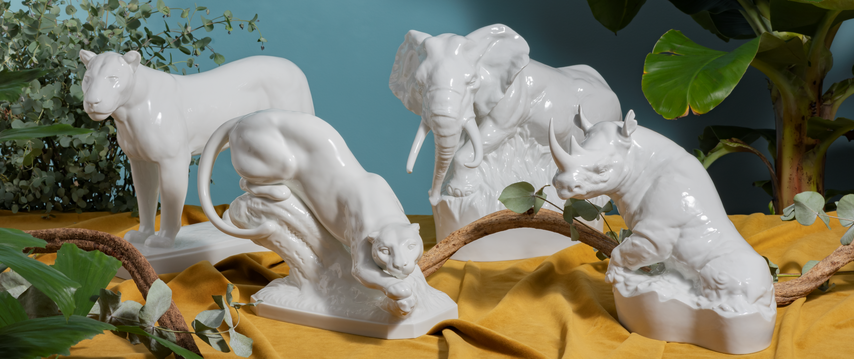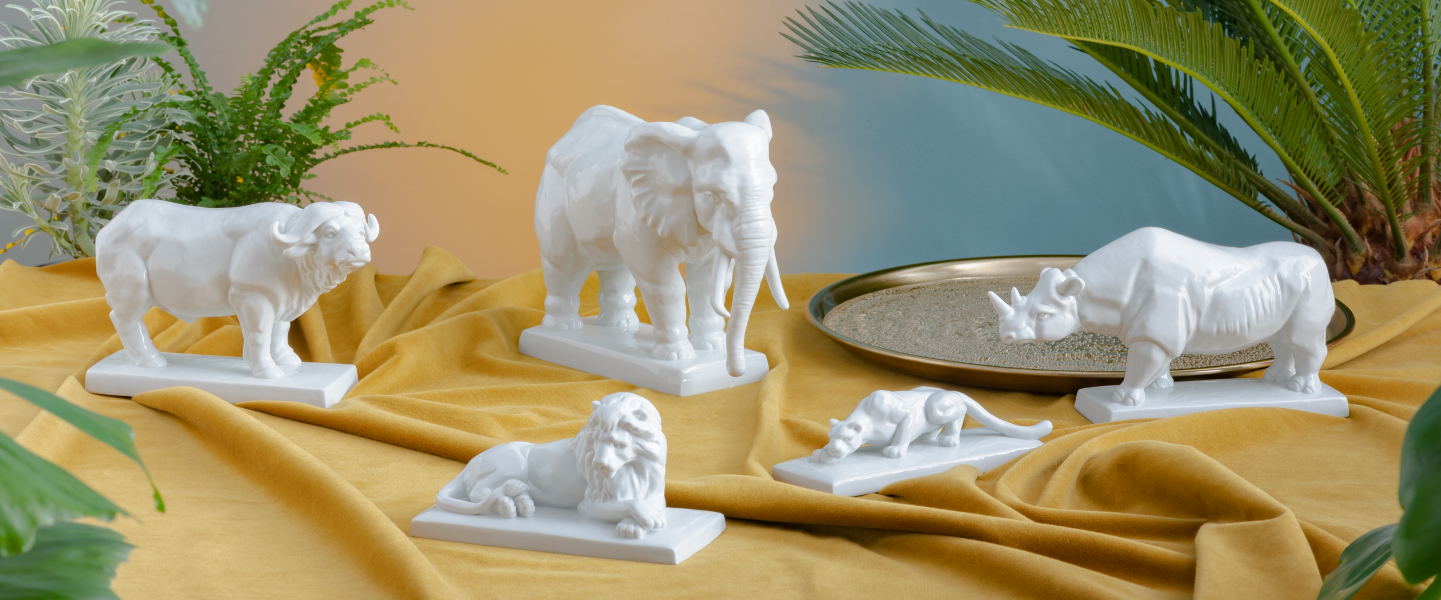 Die atemberaubende Artenvielfalt der Savanne erleben Sie mit der Figurengruppe „Big Five“ des Plastikers Maximilian Hagstotz, der Büffel, Elefant, Nashorn, Leopard und Löwe erstmalig in einer einheitlichen Figurengruppe präsentiert. Dabei ließ sich Maximilian für seine Arbeit nicht nur von der Tierwelt, sondern auch von traditionellen afrikanischen Stilen und Mustern inspirieren. Die naturalistische Darstellung der Figuren wird durch eine dezent kantige Form in Anlehnung an afrikanische Holzschnitzplastiken ergänzt. Auch die in aufwendiger Handarbeit aufgetragene Staffage findet Inspiration in dieser traditionellen Kunstform und bringt das strahlende Weiß des Porzellans zudem noch präsenter zum Tragen.