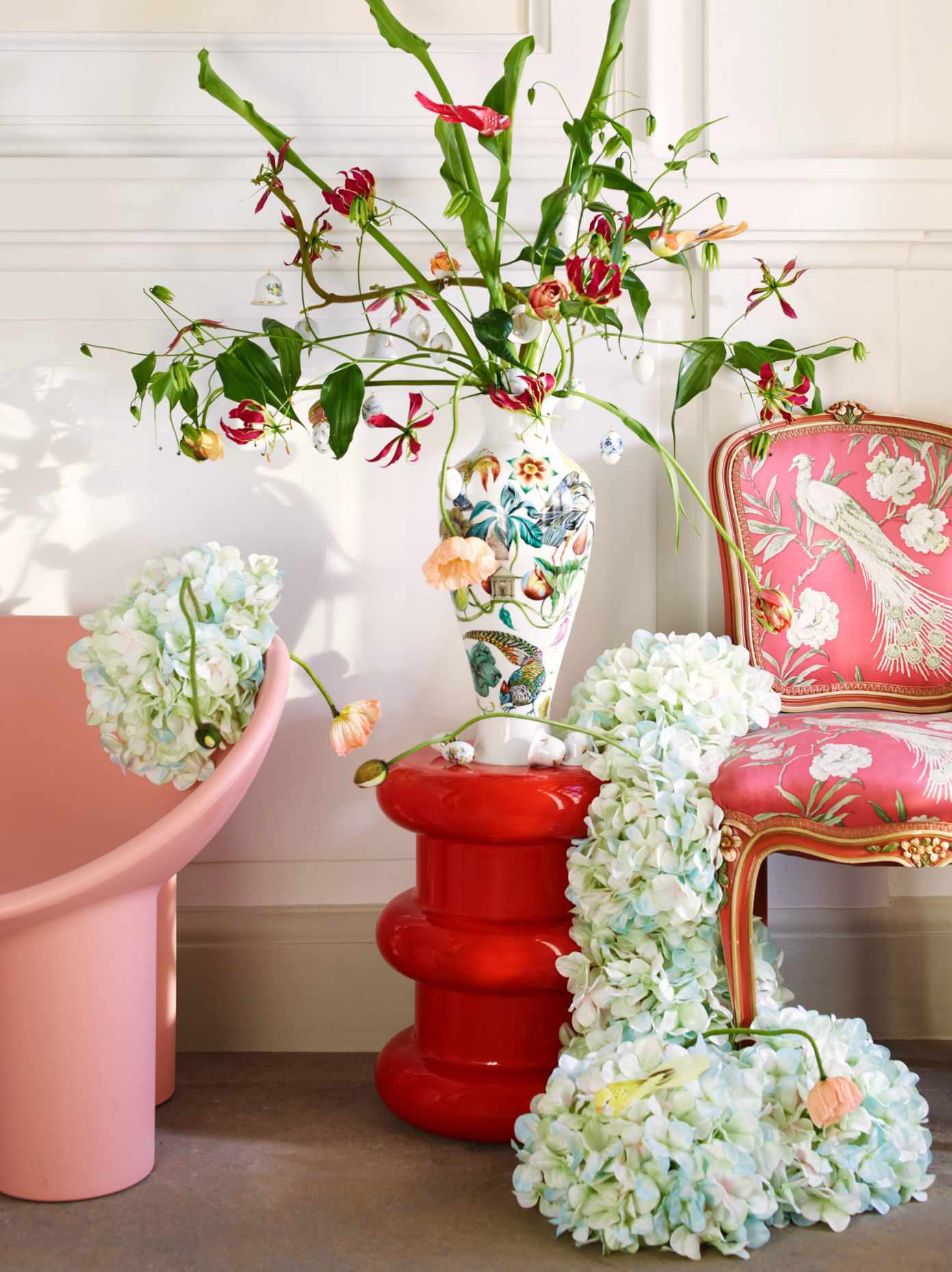 Von Monstera bis Begonia, Sukkulenten und Haworthia – Home Gardening heißt der Trend, der seit geraumer Zeit frischen Wind in die Gestaltung urbaner Räume weht und mit kunstvollen Kreuzungen der Baumarkttristesse und angestaubten Büropflanzen den Kampf ansagt. Gerade jetzt holen wir uns die Pflanzenvielfalt unserer Welt nach Hause und sorgen damit für gemütliche Stimmung und ein lebendiges Umfeld. Mehr Grün für alle, heißt dabei das Plädoyer unter dem auch einst verschriene Naturmaterialien wie Leinen, Bast oder Sisal Einzug in zeitgenössische Interieurs erhalten und gerade im Zusammenspiel mit High-end Objekten einen spannungsreichen Kontrast bilden. Ein farbenprächtiger Strauß in reinweißer oder bemalter Vase wirkt vor opulent begrüntem Hintergrund als Statement umso beeindruckender und schafft Raum für kreatives Arrangieren. Dabei erzeugt die Wahl der Blumen sowie Vase- und Dekortypen ein völlig neues Raumerlebnis.