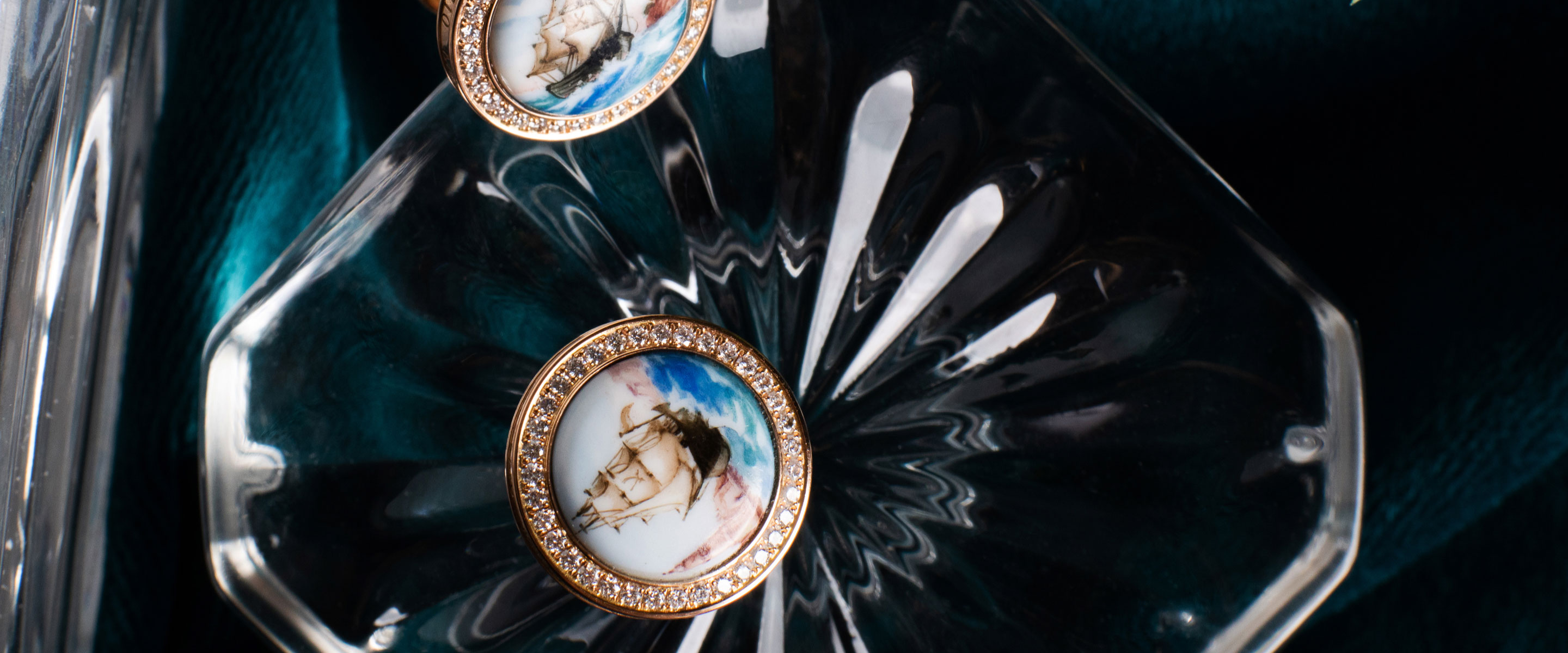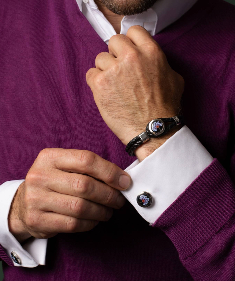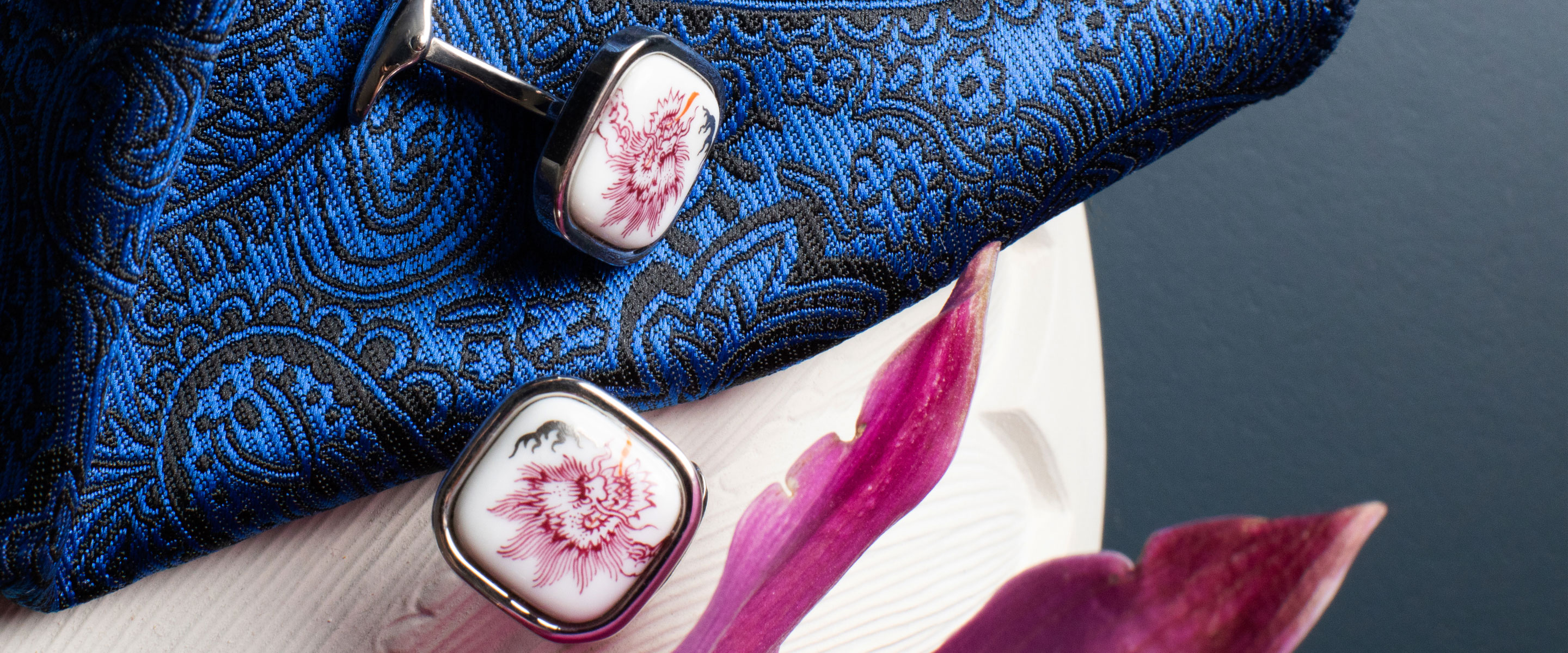 Das Schmuckstück unserer Manschettenknöpfe – die handbemalten Porzellanplättchen mit verschiedenen Motiven – stellen ein echtes dekoratives und handwerklich herausragendes Highlight dar. Auch hier gilt: Das Motiv muss zum Gesamtbild passen. Einfache Motive, wie unsere berühmten gekreuzten Schwerter oder die Taube mit Olivenzweig, passen besser zu einem auffälligen Sakko oder wenn die Accessoires nur dezent daherkommen sollen. Extravagante Motive wie die blaue Blüte, die Lilie oder der Tiger entfalten ihre Pracht besonders bei klassischen Anzügen. Ebenso ist es bei den Schiffen der limitierten Edition: Die in meisterhafter Miniaturkunst bemalten Porzellanplättchen machen den Manschettenknopf zum absoluten Hingucker der Extraklasse.