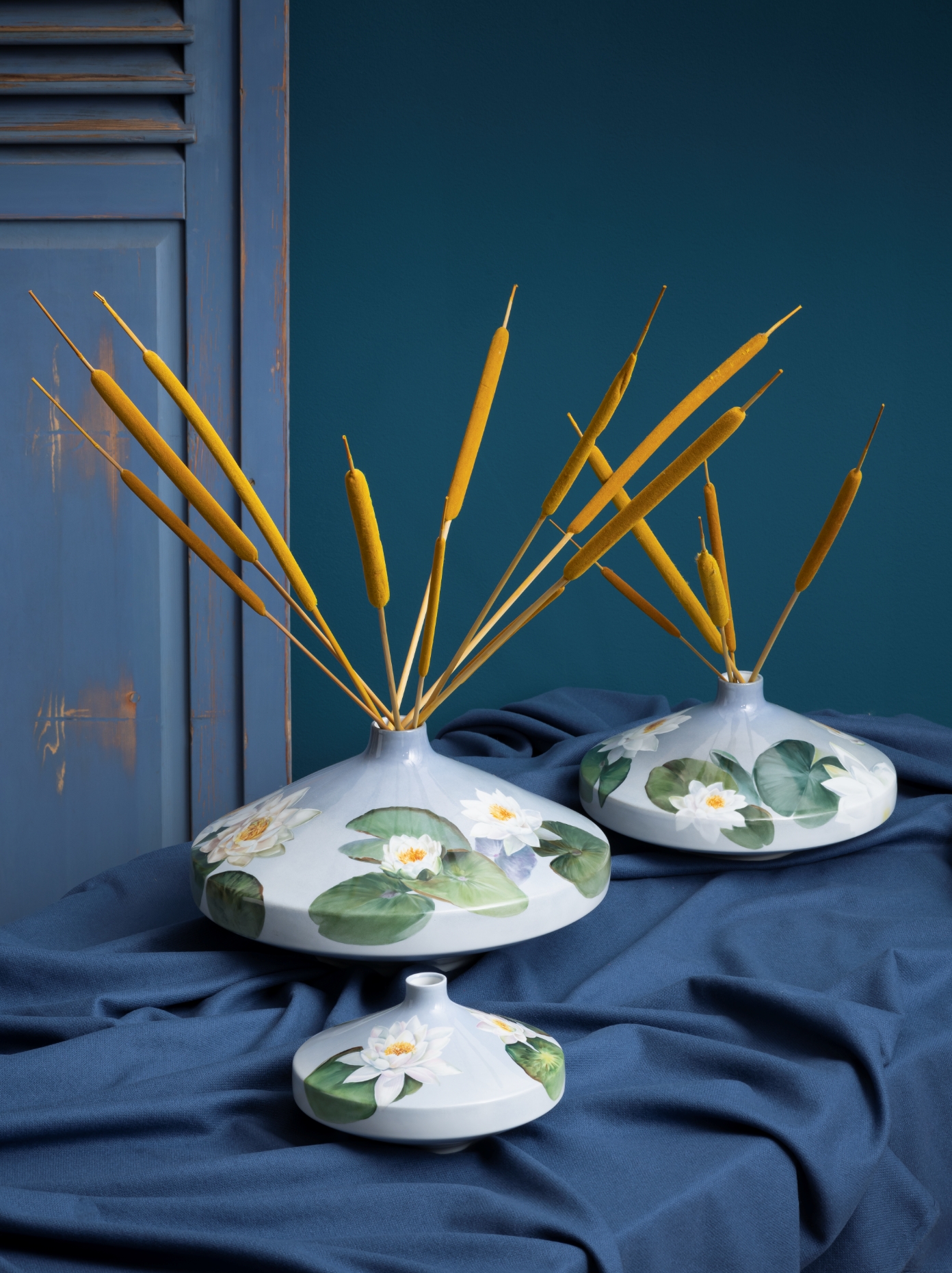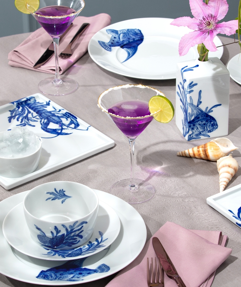 „Wie von sanften Wellen und einer Meeresbrise geleitet, fangen die fließenden Pinselstriche der maritimen Dekore eine faszinierende Unterwasserwelt auf Tellern, Vasen und Gefäßen in leuchtender Blaumalerei ein und lassen maritim sommerliches Ambiente im eigenen Interieur einziehen.“