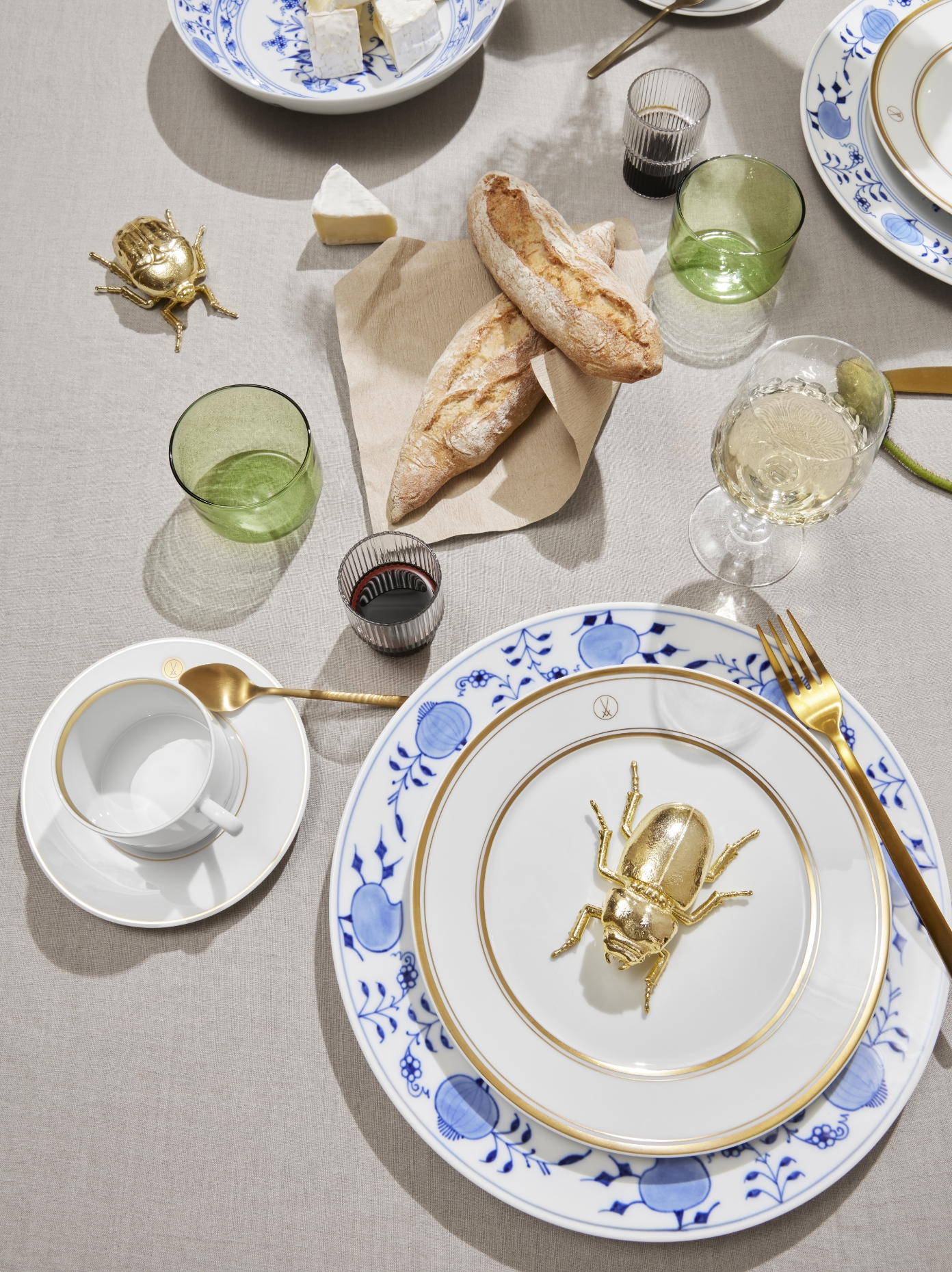 • Mixen Sie ganz bewusst die verschiedenen Stilrichtungen und bringen Sie Ihre historischen Erbstücke auf den Tisch. Dem historischen „Zwiebelmuster“ verleihen Sie neuen Glanz mit Porzellanen unserer „N°41 Paradise Birds Blush“ Kollektion. Die farblichen Akzente in Grün oder Rosa bringen Lebendigkeit und Frische auf den gedeckten Tisch. Zugleich umrahmen sie das ikonische Blau des Zwiebelmusters und heben es auf besondere Weise hervor. Wer es noch ein Stück farbenfroher mag, der kombiniert zum Zwiebelmuster die „Bloomy Feathers“ Porzellane aus unserer „THE MEISSEN COLLAGE“ Serie. Das Dekor kombiniert die unverwechselbaren Elemente des Originals in zartem Blau mit kräftigen Rottönen der markanten Feder. Die farblichen Kontraste sorgen für eine aufregende Verbindung, die den einzigartigen Charakter des Zwiebelmusters in neuem Glanz erstrahlen lässt.