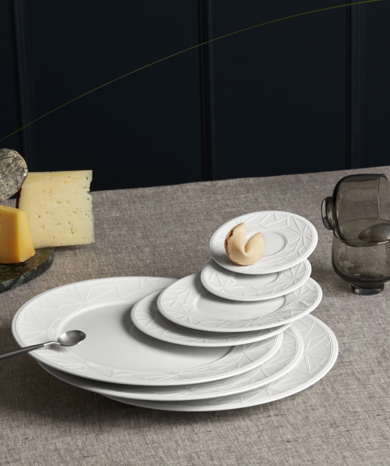 Lassen Sie bei weißen Porzellanen auch verschiedene Haptik in Ihre Arrangements einfließen. Das „Wellenspiel Relief“ wie auch die „Royal Blossom“ Porzellane gibt es in glasiert und Biskuit. Wählen Sie zum Beispiel einen Platzteller aus Biskuit-Porzellan und einen glasierten Speiseteller, das sorgt für Abwechslung und Spannung auf der Tafel. Denn in dem Biskuit Porzellan bricht das Licht anders als bei den glasierten Varianten, was für ein einzigartiges Licht-Schattenspiel sorgt. Zudem ist es ein Erlebnis für die Sinne, die unterschiedliche Haptik zu sehen und zu fühlen.