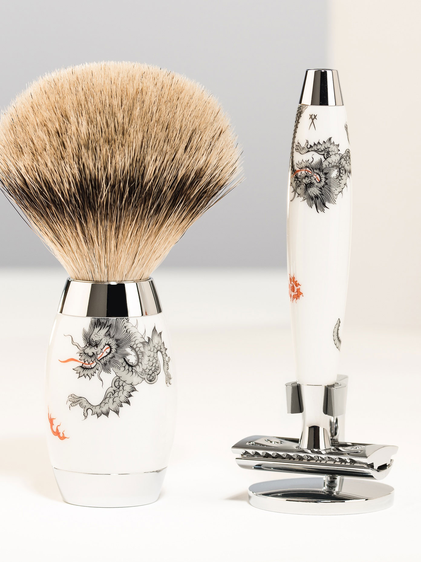 Langlebigkeit, einzigartige Designs und außergewöhnliches Kunsthandwerk sind Werte die Mühle und MEISSEN verbinden und sie zu dieser einzigartigen Kooperation inspiriert haben. Die „Mühle Edition MEISSEN“ umfasst zwei Rasierpinsel, einen Pinselhalter, einen Rasierer und Rasierhobel. Voluminösere Formen und eine ausdrucksvolle Silhouette verbinden sich mit dem für MÜHLE typischen, puristischen Gestaltungsprinzip. Feinstes Meissener Porzellan, verchromtes Metall und erlesenes Pinselhaar spiegeln Extravaganz und das gewisse Etwas wider. Alle Porzellan-Griffköper sind mit dem Meissener "Ming-Drachen" dekoriert. Dieser wird von Hand, durch unsere erfahrenen Manufakturisten, aufgemalt und gehört zu unseren beliebtesten Dekoren. In der chinesischen Philosophie steht der Drache für Weisheit, Stärke und Erfolg und ist damit das perfekte Dekor für den modernen Mann. Jedes Produkt ist dabei ein Unikat und wird nur auf Bestellung für Sie gefertigt.