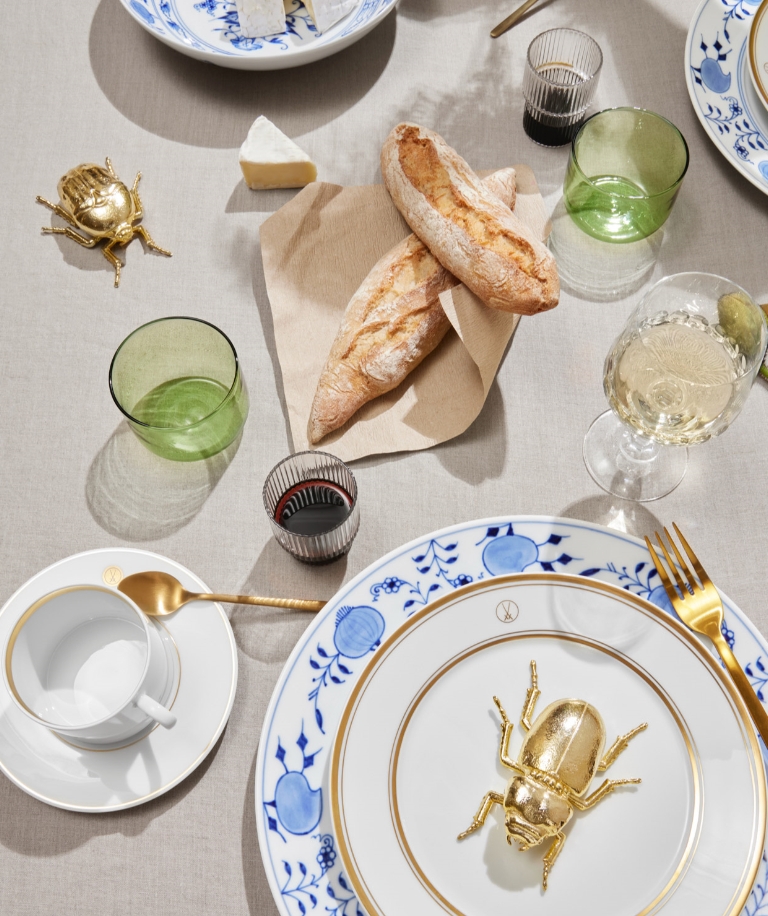 Auch bei MEISSEN kommt der Farbe Blau eine besondere Bedeutung zu. Als eine der ersten Farben überhaupt gilt das Meissener Kobaltblau als eine der wichtigsten Errungenschaften des manufaktureigenen Farblabors – ein Blau, welches das strahlende Weiß des Porzellans hervorhebt und gleichzeitig mit ihm harmoniert. Mit ihm war eine gestalterische Tradition, die Blaumalerei geboren und der Grundstein gelegt für solch ikonische Motive wie dem „Zwiebelmuster“ und nicht zuletzt den Gekreuzten Schwertern, die bis heute als Gütesiegel jedes Stück Meissener Porzellan zieren.