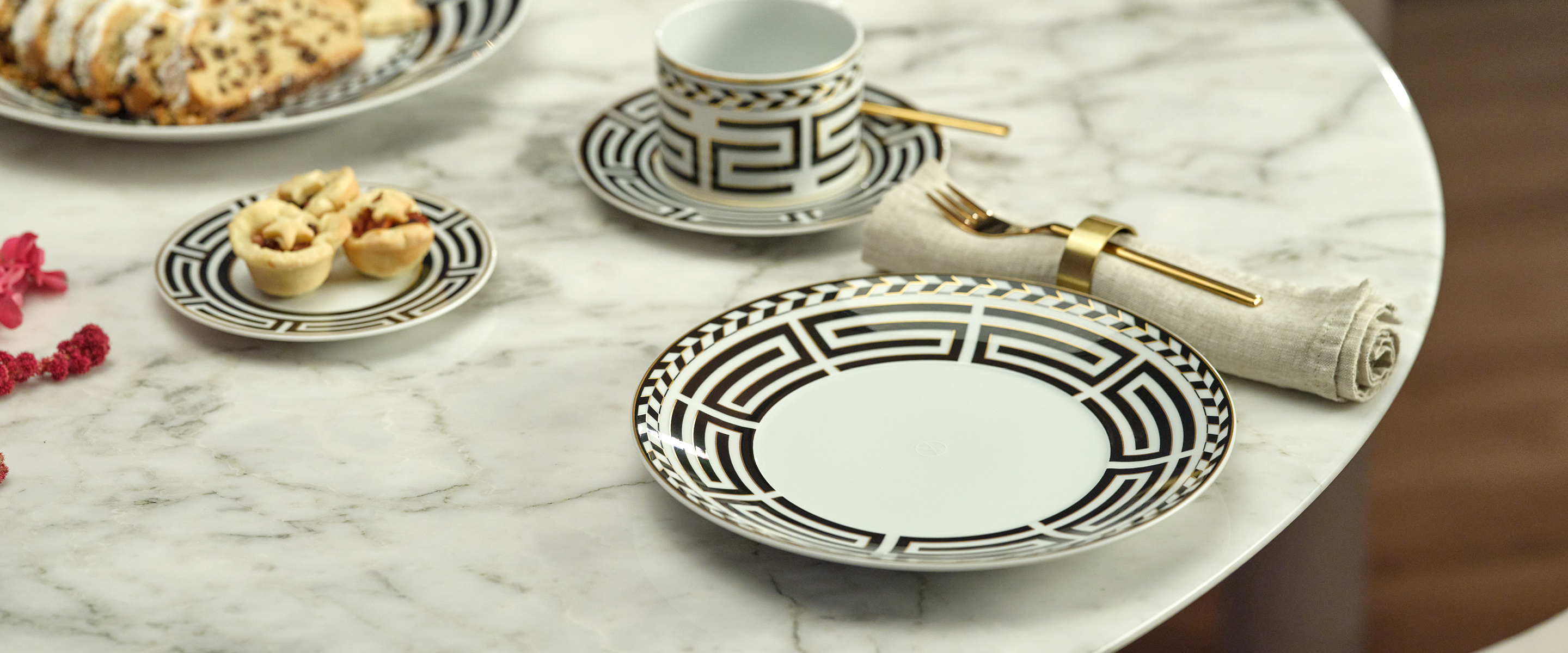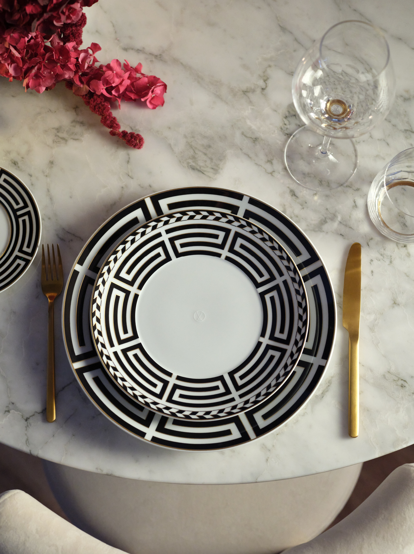 Nicht zum ersten Mal dienten die mäanderartigen Bodenmosaike der geschichtsträchtigen Albrechtsburg als Vorbild: Mit der Kollektion „Royal Meander“ ist dem MEISSEN Atelier eine moderne Interpretation und Weiterentwicklung des renommierten MEISSEN Dekors „Royal Palace“ gelungen. Die filigranen Kantenmuster am äußeren Rand der Tellerfahne greifen architektonische Elemente des Schlosses auf und tragen die DNA von MEISSEN durch eine zeitgenössische Designsprache in die Zukunft.