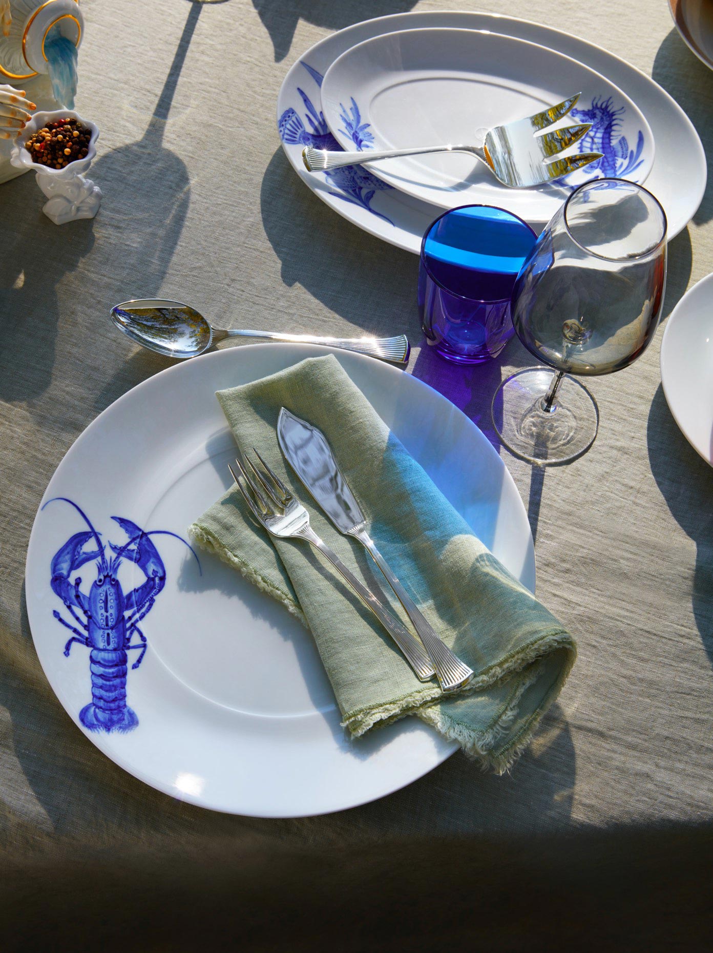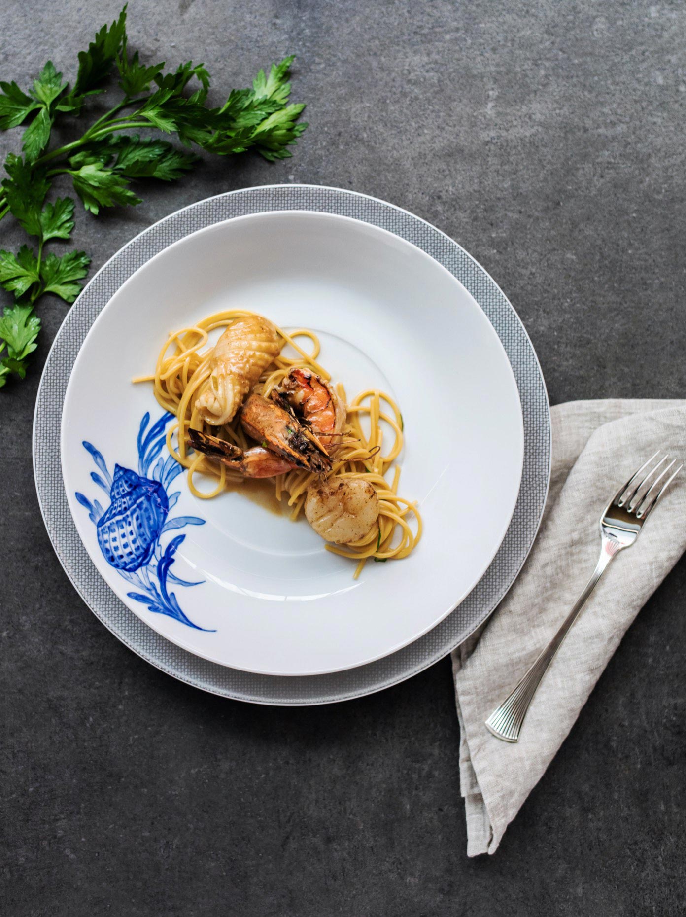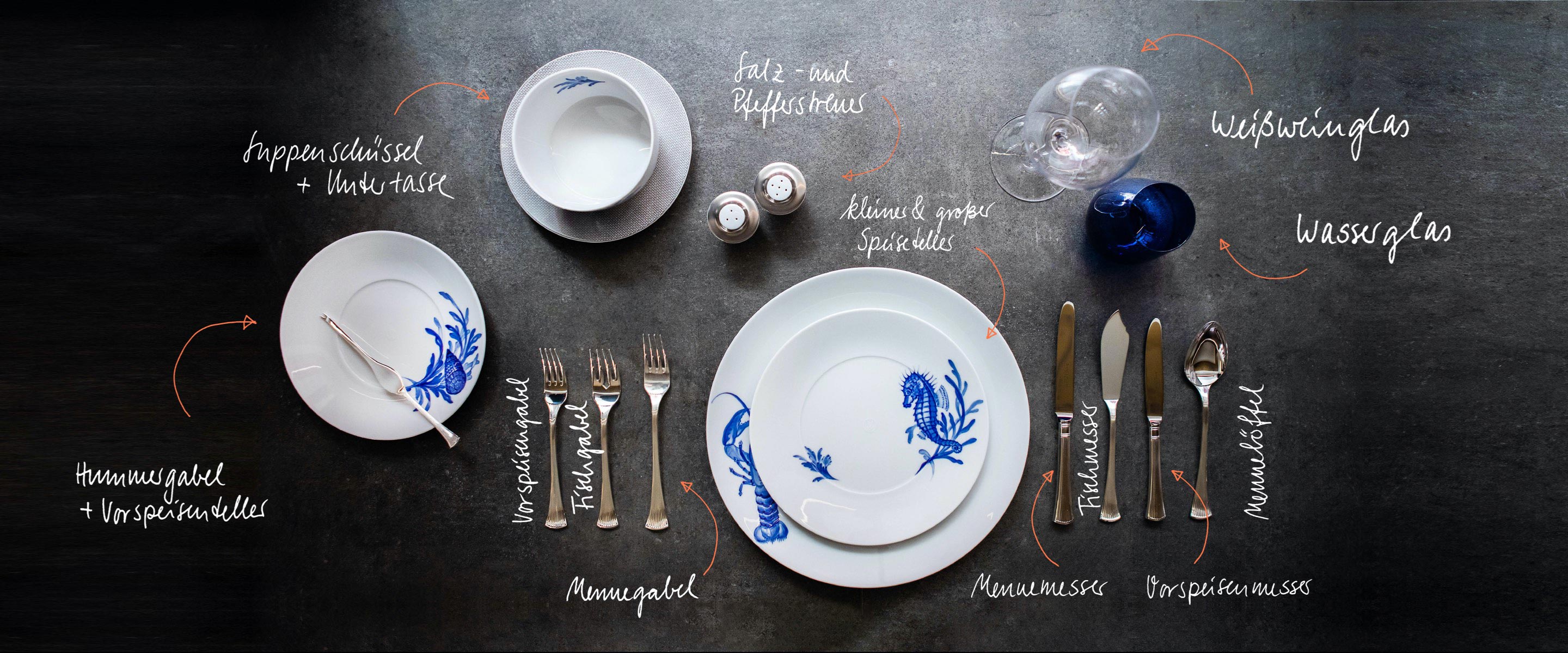 "Mit der neuen Kollektion „Maritime“, mit seinen bewegten Unterwassermotiven im strahlenden Kobaltblau, lassen sich Fischmenüs ideal in Szene zu setzen."