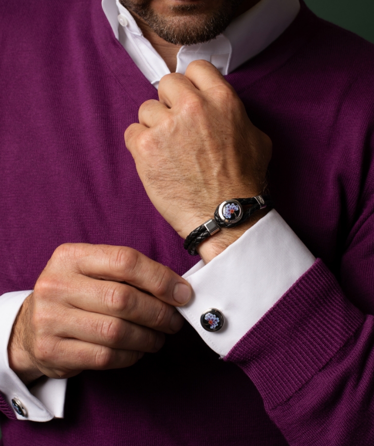 Wenn Sie Lila in Ihre Mode integrieren oder als Accessoires kombinieren, unterstreichen Sie eine geheimnisvolle und exquisite Ausstrahlung mit diesem Farbton. Der Mann kann seine farblichen violetten Accessoires in Manschettenknöpfen, Reversnadel oder Siegelring finden. Mit dem Dekor des purpurfarbenen Ming-Drachen setzt er in seinem Look gezielt Akzente. Denn in Purpur erstrahlt das Rot mit leichten blauen Nuancen und war einst die teuerste Farbe der Welt, die Königen und geistlichen Würdenträgern vorbehalten war. Aus diesem Grund fasziniert Purpur noch heute und symbolisiert royale Extravaganz.
