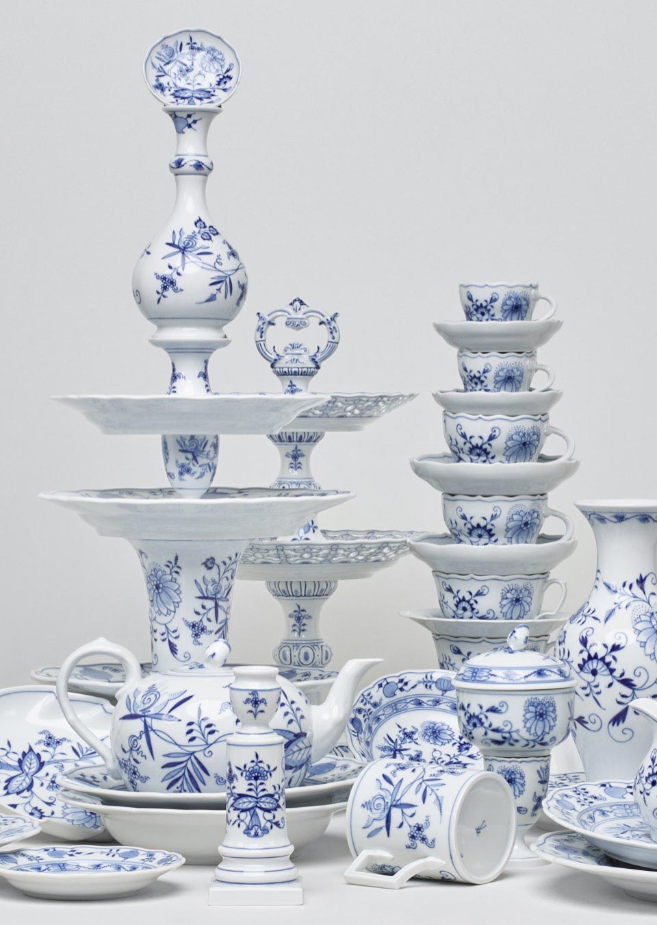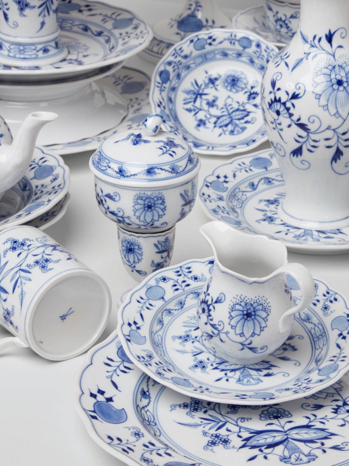 • Die Entwicklung des manufaktureigenen Kobaltblaus – der Beginn der langen Tradition der Blaumalerei bei MEISSEN – ist unmittelbar mit der Entwicklung des „Zwiebelmuster“ verbunden, dem erfolgreichsten Blaudekor der Porzellangeschichte. Bereits kurz nach der Gründung der Manufaktur im 18. Jahrhundert war MEISSEN bestrebt, ein hitzebeständiges Blau zu finden, welches das Weiß des Porzellans sowohl hervorhebt als auch mit diesem harmoniert. In langen Versuchsreihen erwies sich hierbei die Verbindung von Kobalt und Sauerstoff als äußerst widerstandsfähig. Eine Entdeckung die 1739 gleichsam die Geburt des weltberühmten „Zwiebelmusters“ nach sich zog. Eine Erfolgsgeschichte in die sich mittlerweile Dekore wie die moderne Neuinterpretationen des „Zwiebelmusters“, der Dekor „Noble Blue“, der zarte Dekor „Blue Orchid“ oder der neue Dekor „MEISSEN Blue Treasures“ einreihen.