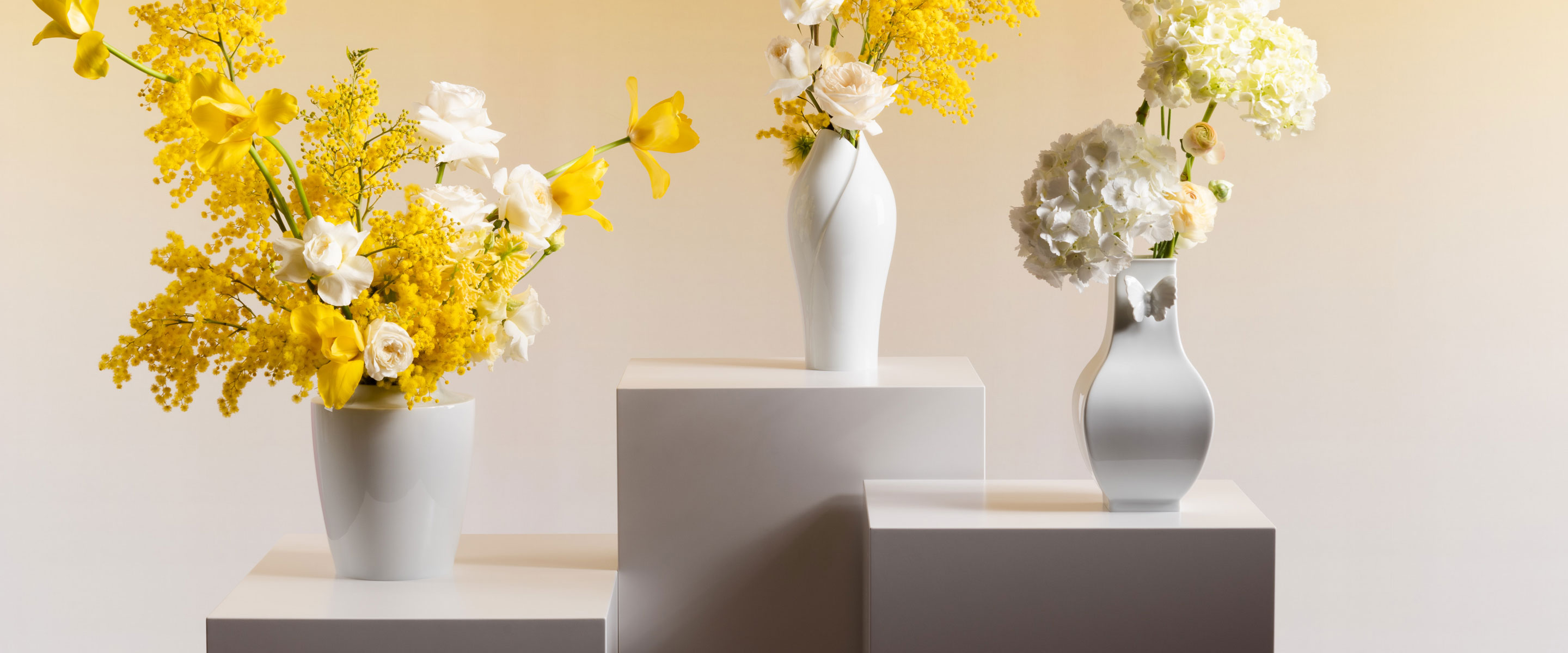 In manchen Fällen ist es ratsam, Blumen und Vasen in einer ansprechenden Vielfalt zu einer beeindruckenden Gesamtkompositionen zusammenzustellen - und manchmal ist weniger einfach mehr. Limitierte Meisterwerke, wie die “Vase Exotic 1“ sind wahre Prunkstücke der Porzellankunst und strahlen eine derart eindrucksvolle Präsenz aus, dass diese auch allein beeindruckt. Die "Vase Antartica" wiederum eignet sich perfekt, für komplexe Arrangement mit zahlreichen Vasen und vielfältigen Blumen. Kein Wunder, denn ihre einzigartige Form wurde von Pinguinen inspiriert - und diese treten schließlich in Kolonien auf uns sind ein Symbol für Gemeinschaft und Zusammenhalt.