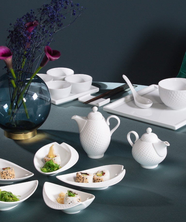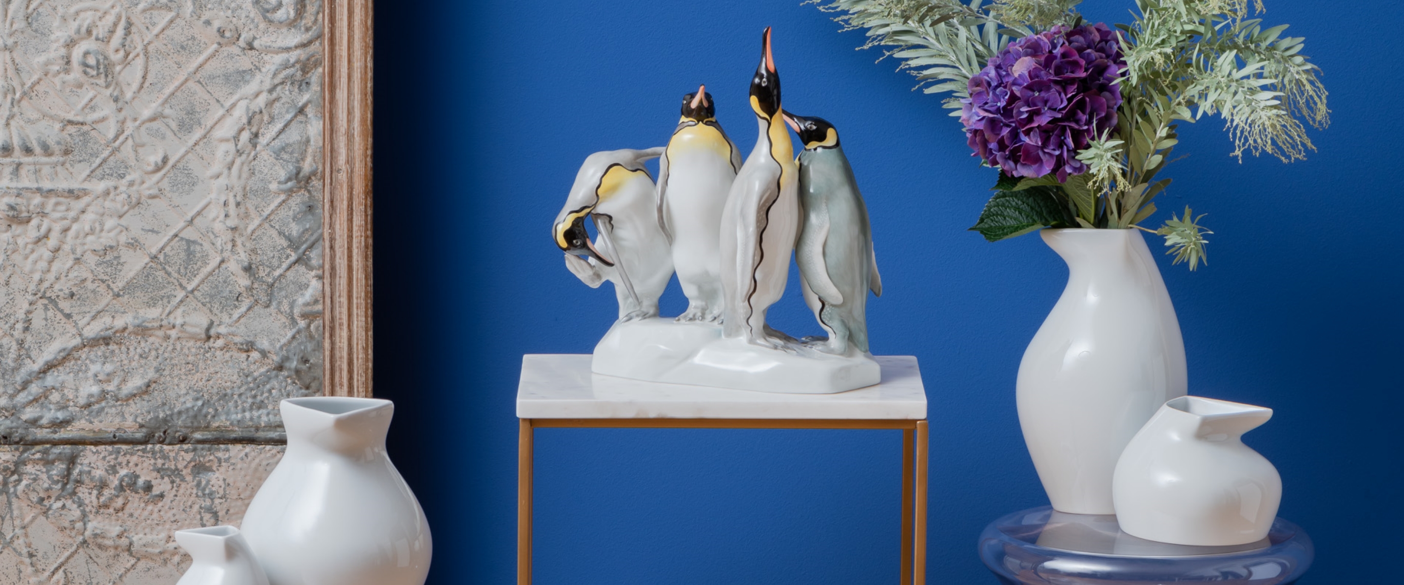 Eines der ersten Projekte von Zhuoyu Hou für MEISSEN war die „Antarctica“ Kollektion, welche von einer arktischen Eislandschaft und einer Pinguinfamilie inspiriert wurde. Die formgebenden dynamischen Rundungen stehen in Kontrast zu den kantigen Öffnungen und visualisieren den Bauch und Kopf der Pinguine. Die unterschiedlichen Größen repräsentieren dabei die Mitglieder der Pinguinfamilie – Mama, Papa, ein großer und ein kleiner Bruder. Die Größenvarianzen ermöglichen einen vielseitigen Einsatz im Alltag, als Einzelstücke oder als Arrangement verschiedener Objekte der Serie. Denn inspiriert durch die Eislandschaft entwickelte die Designerin zudem verschiedene Schalen, Kerzenhalter und Becher. Zhuoyu Hou selbst verwendet die Krüge nicht nur für Blumen, sondern auch als Wasserkaraffe oder Milchkännchen und die Schalen für Obst oder Snacks.