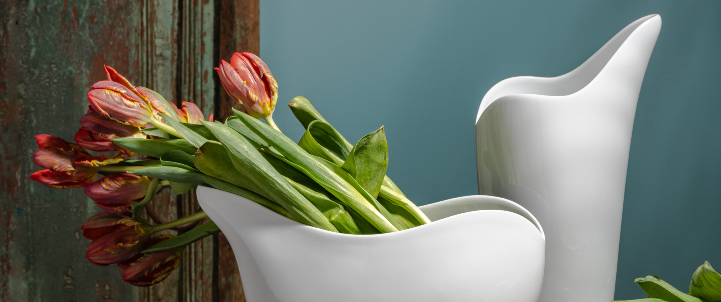 Die chinesischen Wurzeln der Produktdesignerin inspirierten sie auch zu dem Vasenpaar „Ying und Yang“. Trotz ihrer unterschiedlichen Höhe und Breite haben beide Vasen das gleiche Volumen, was für das Gleichgewicht zwischen Ying und Yang steht. Die beiden Vasen eignen sich hervorragend, um Blumensträuße auf eine neue und ungewöhnliche Art zu präsentieren.