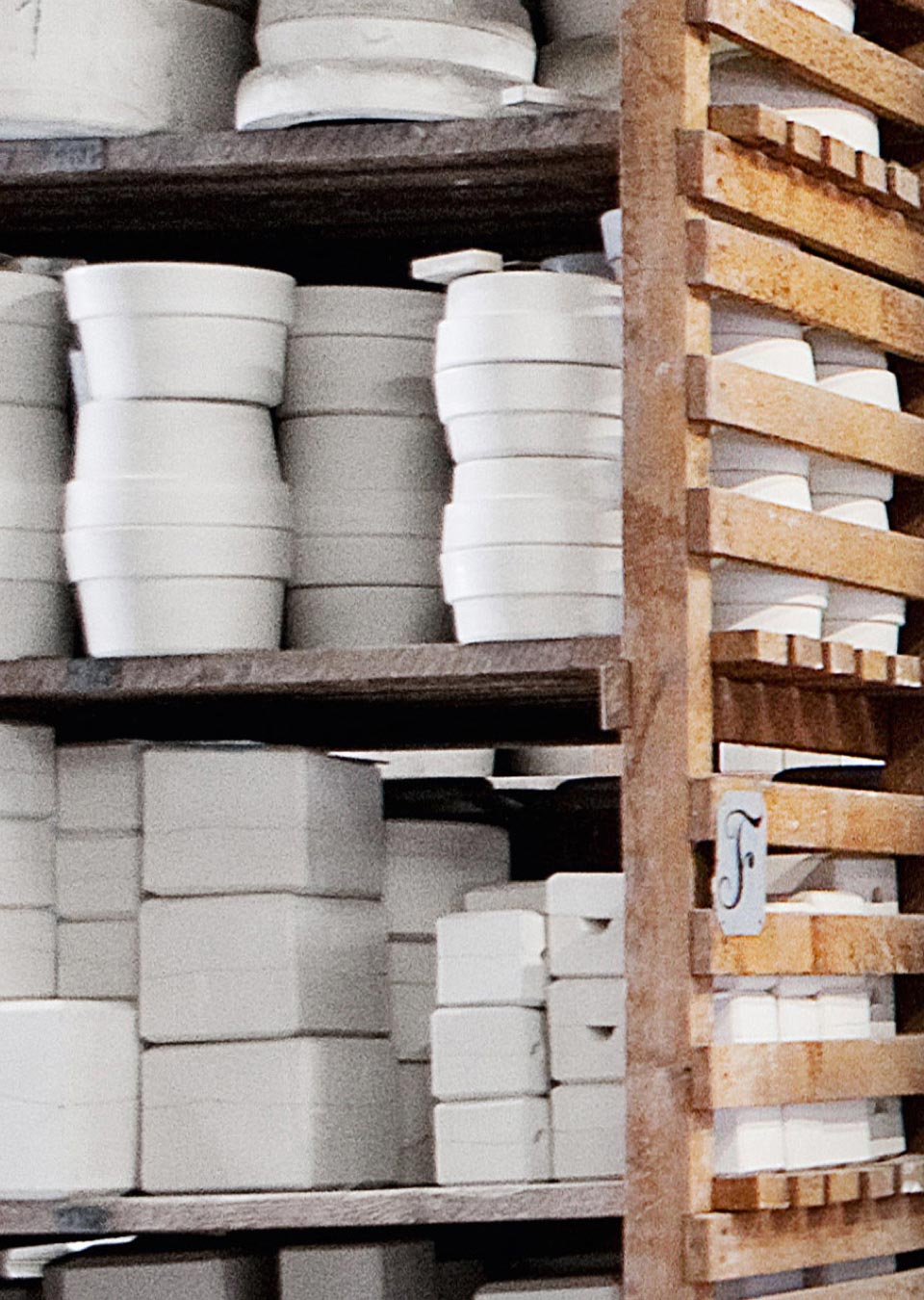 ShapingAll Meissen porcelain pieces are brought into shape using one of three techniques: throwing, casting, or forming. Plates and cups are thrown by hand on spinning wheels, first as blank workpieces, then gently pressed into plaster moulds to create their outer contours and detailing. A stencil is used for inner contours and thickness. For casting, the liquid porcelain paste is poured into a plaster mould, where it is left to dry and solidify. Excess porcelain paste is poured out. Every plaster mould is divided into several wedges, which are taken away one by one so that the porcelain can be taken out without damaging it. The up to 100 pieces of a sculpture are made by pressing the porcelain paste into plaster moulds: two halves that are then pressed together to create a full piece. After a set drying time, this is then taken out and handed on to the embossers for further assembly. -