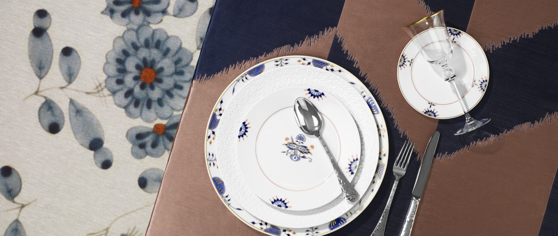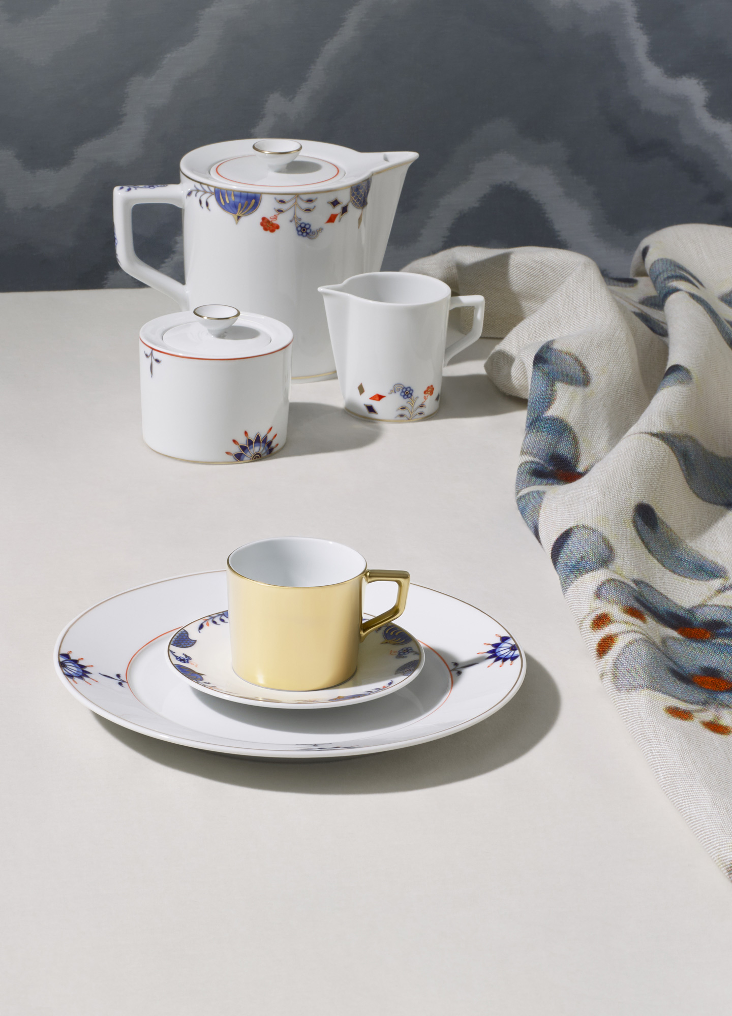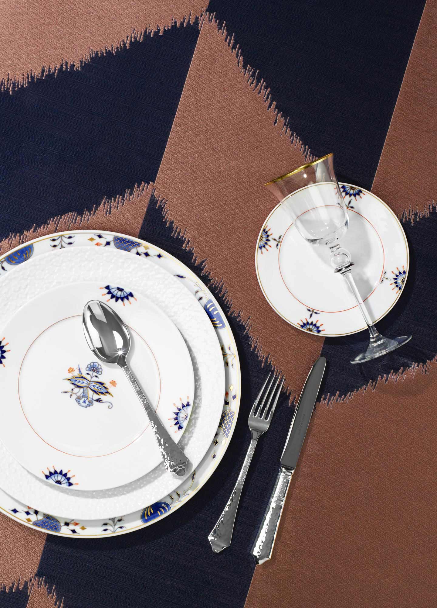 Meissen’s “Onion Pattern”, which is nearly three centuries old, takes new shape in the “Noble Blue” collection, which contrasts the opulence of the original design with modern esprit. Classical elements are taken up in their original form and rearranged on the sleek “N°41” table service ensemble. In accordance with tradition, “Noble Blue”, like the “Onion Pattern” itself, features Meissen’s crossed swords embedded into the bamboo stalks – a symbol that guarantees the highest porcelain quality as a trademark of the manufactory. Characteristic for the pattern is the use of the manufactory’s own cobalt blue. Motif details in bright red and filigree gold finishes complement the colour palette of the “Noble Blue” table service and form the perfect contrasting complement to the deep cobalt hue.