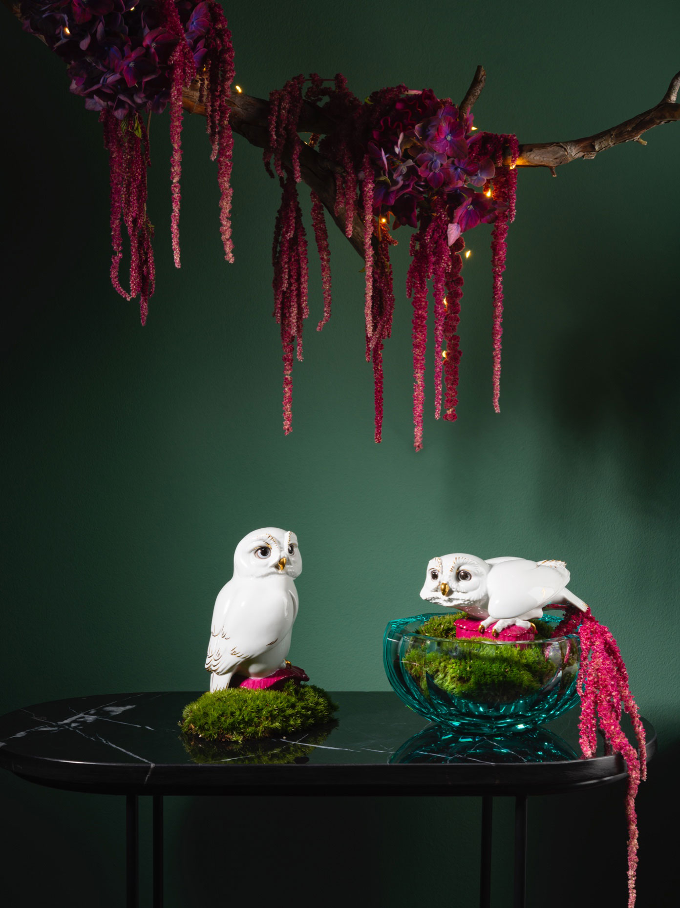 In a new staffage with purple and gold, two heart-winning owls of the Meissen artist Max Esser from the year 1933 present themselves this Christmastime. The owl series, which already exists in white, with naturalistic painting and from Böttgersteinzeug, is thus extended by a trendy variant.