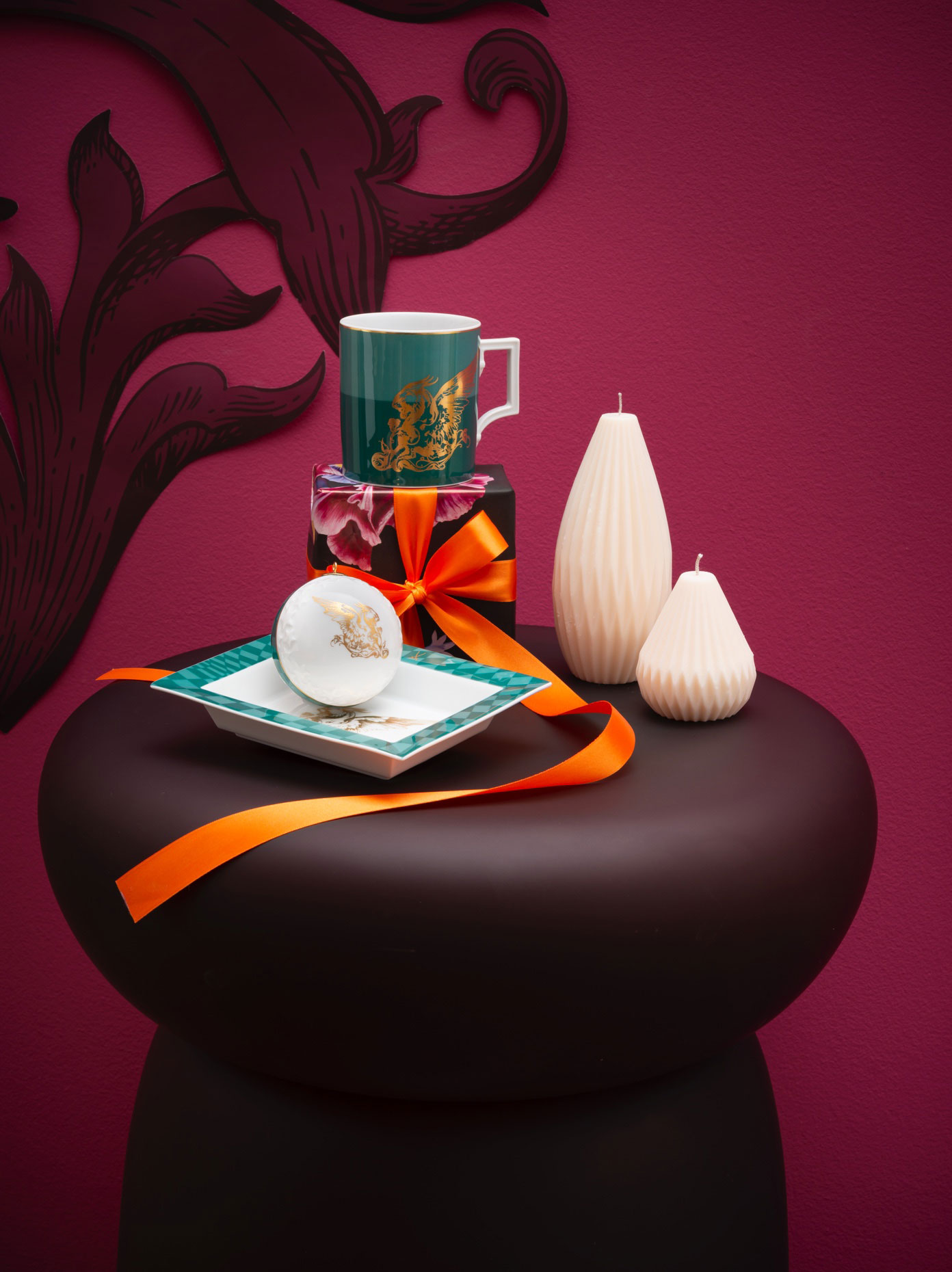 The dynamic and power of the winged lioness fascinated the designers of the porcelain manufactory so much that an adaptation of the proud animal found its way onto various vide poches, mugs and Christmas tree balls. A forest-like petrol green - the Christmas colour of 2022 - brings mysticism and Christmas spirit to the porcelain and sets off the precious gold drawings particularly well.