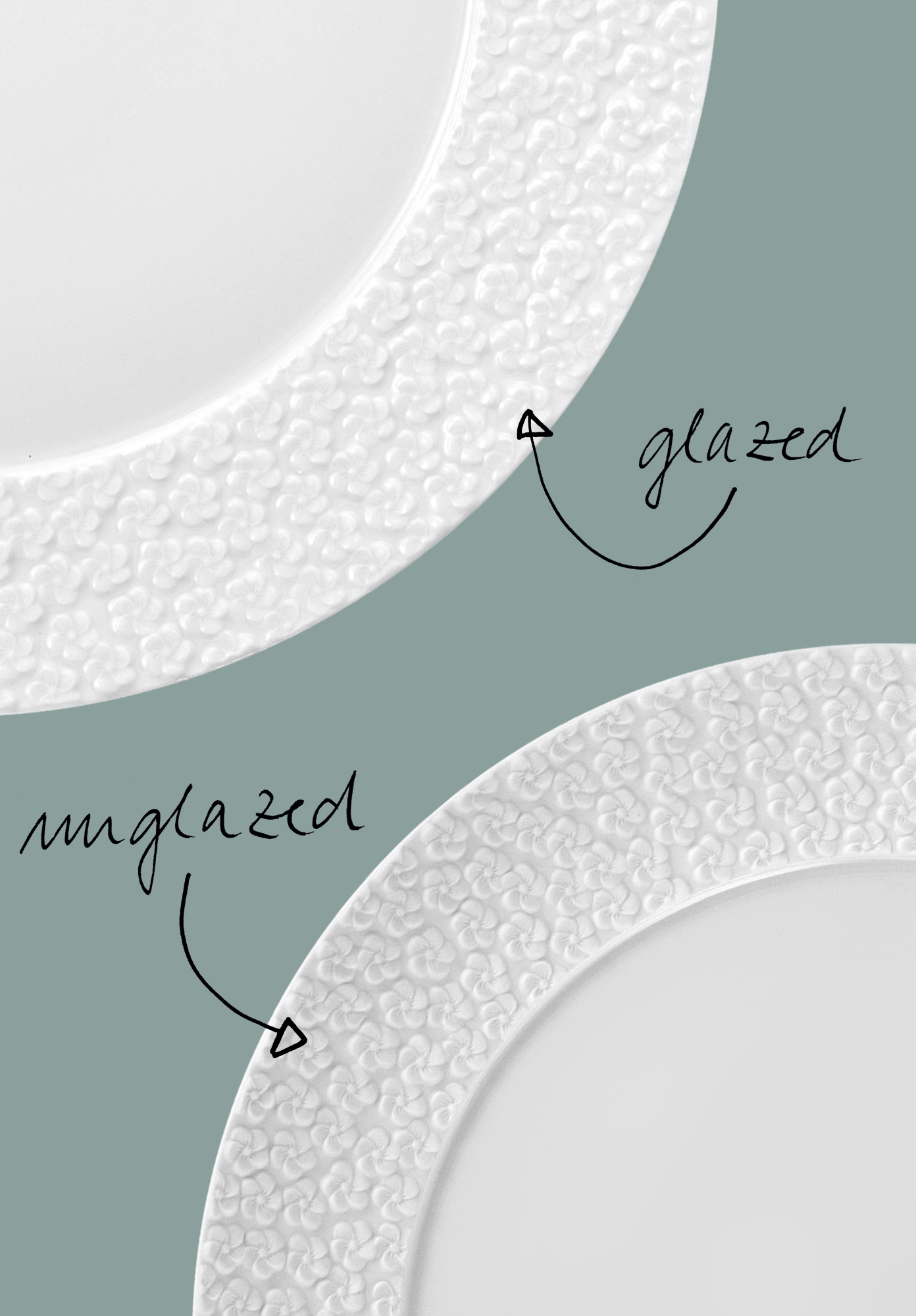 Like glazed porcelain, bisque shrinks during the second firing at 1,400°C, sealing off all pores. The finished product is microwave- and dishwasher-safe and even resistant to stubborn stains, as well as acidic or dyeing substances. Once cooled after firing, the porcelain’s rough surface is smoothed by hand using an elaborate polishing process, preventing any stains from setting. In case of more stubborn marks, bisque pieces can be soaked in soapy water like any other crockery and then cleaned with a sponge.