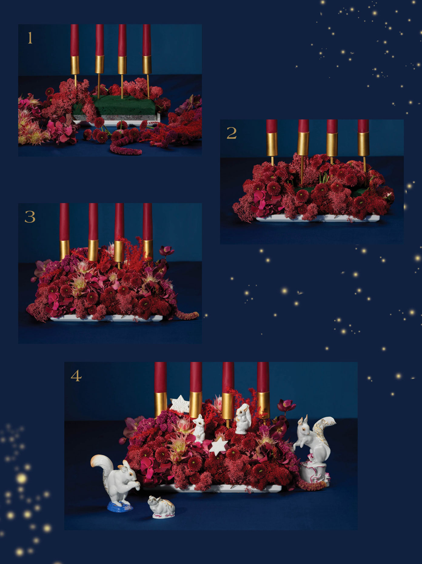 onto a “MEISSEN® Cosmopolitan” platter and insert 4 metal candle holders into the foam whilst keeping the same distance from one another. Spread Iceland moss in small bundles all over the plugging foam and fasten with ivy needles or adhesives.