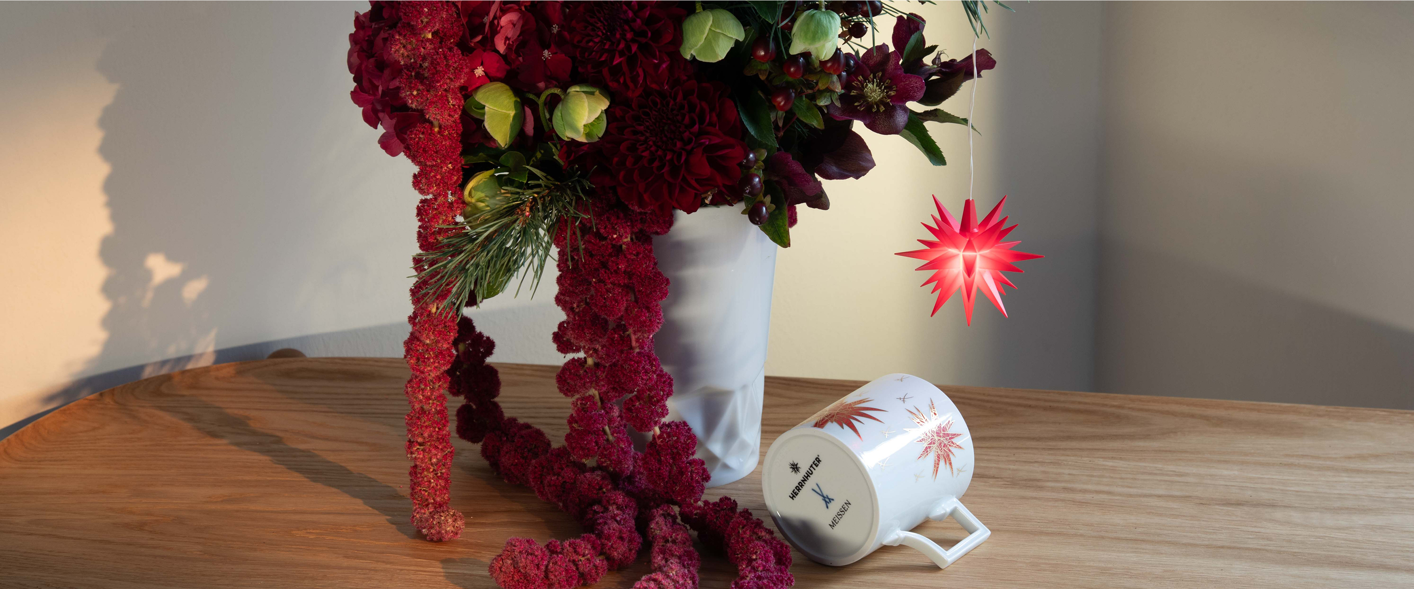 • This Christmas season, MEISSEN and Herrnhut® have joined forces in an extraordinary collaboration to present a unique gift set consisting of an iconic MEISSEN mug, decorated with the Christmas Herrnhut® star design, and a miniature Herrnhut® star. This set combines the traditional porcelain manufactory with the Christmas symbolism of the star and offers a festive combination that is both visually and symbolically impressive.