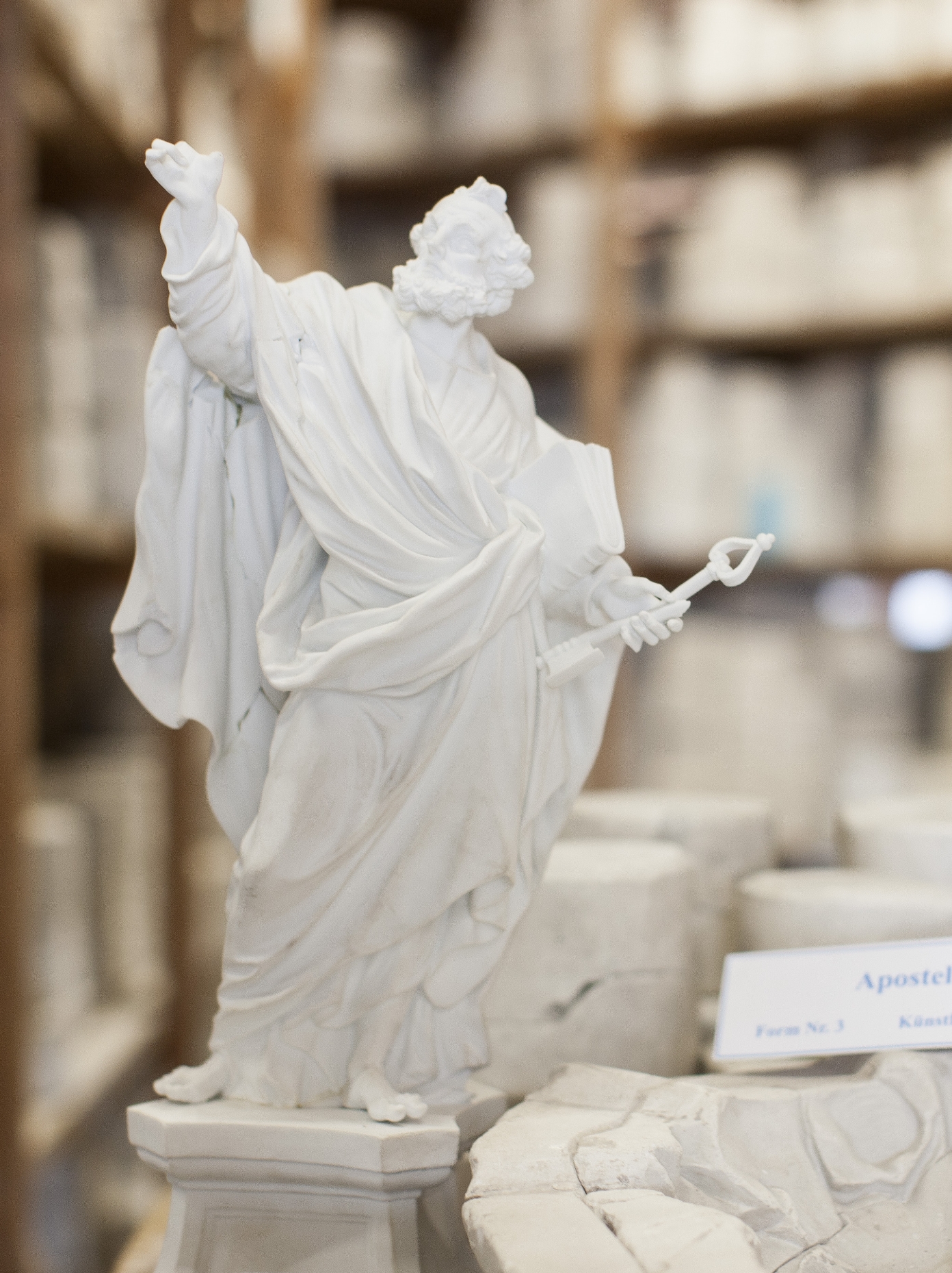 One of the oldest mother moulds in our archive tells a very impressive story. The moulds for the Apostle Petrus from 1738. This figurine was created by Johann Joachim Kaendler, the impressive model master and sculptor of our manufactory, along with 11 other apostles at the request of the Saxon Elector Friedrich August II. They were to be a gift to the Elector's mother-in-law, who was to admire the original larger-than-life marble sculptures that stood in the Roman Lateran Basilica as porcelain figurines in her chambers. Kaendler himself did not go to Rome to do this, but worked from drawings that are now lost, which explains the slight deviations from the originals. But Kaendler, as a master of his craft on a par with the great stone sculptors of the Baroque, reinterpreted these majestic figurines with their richly folded robes in his own language in a small format and stamped them with his unique handwriting.