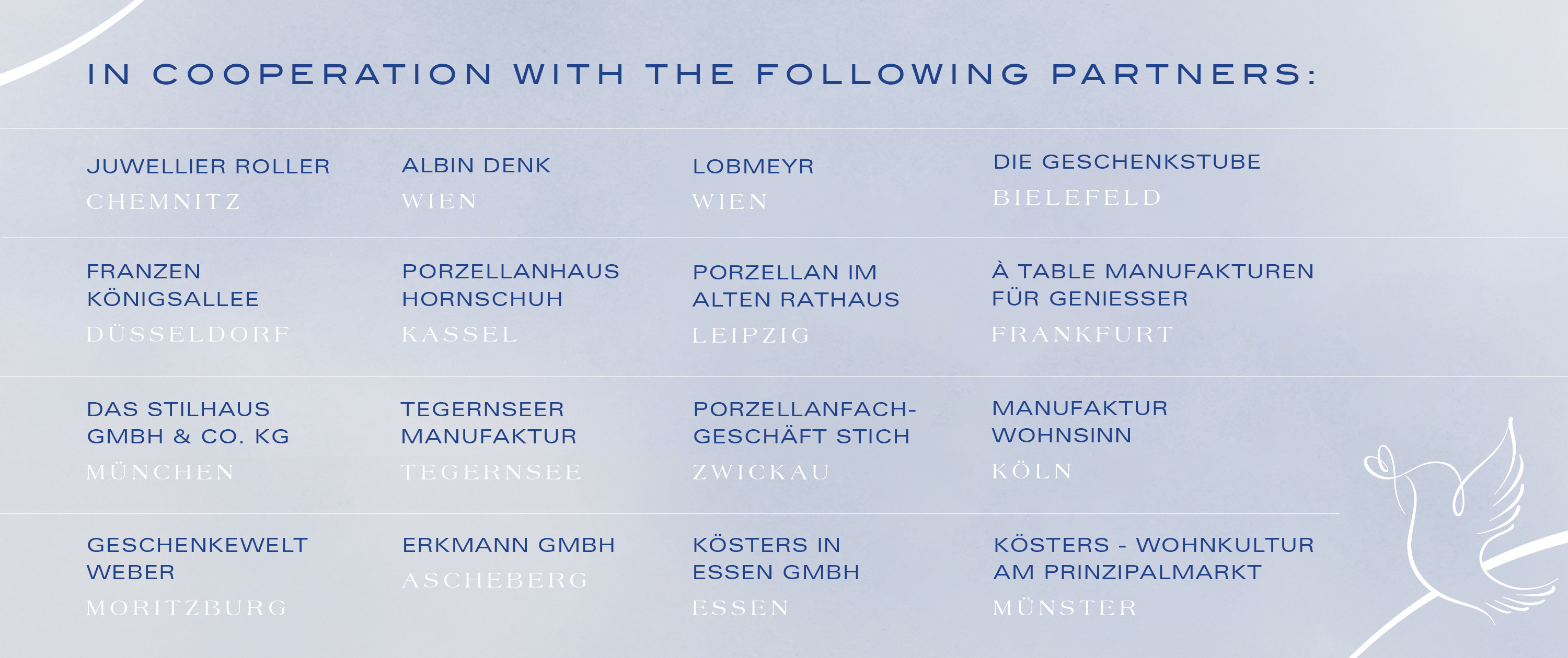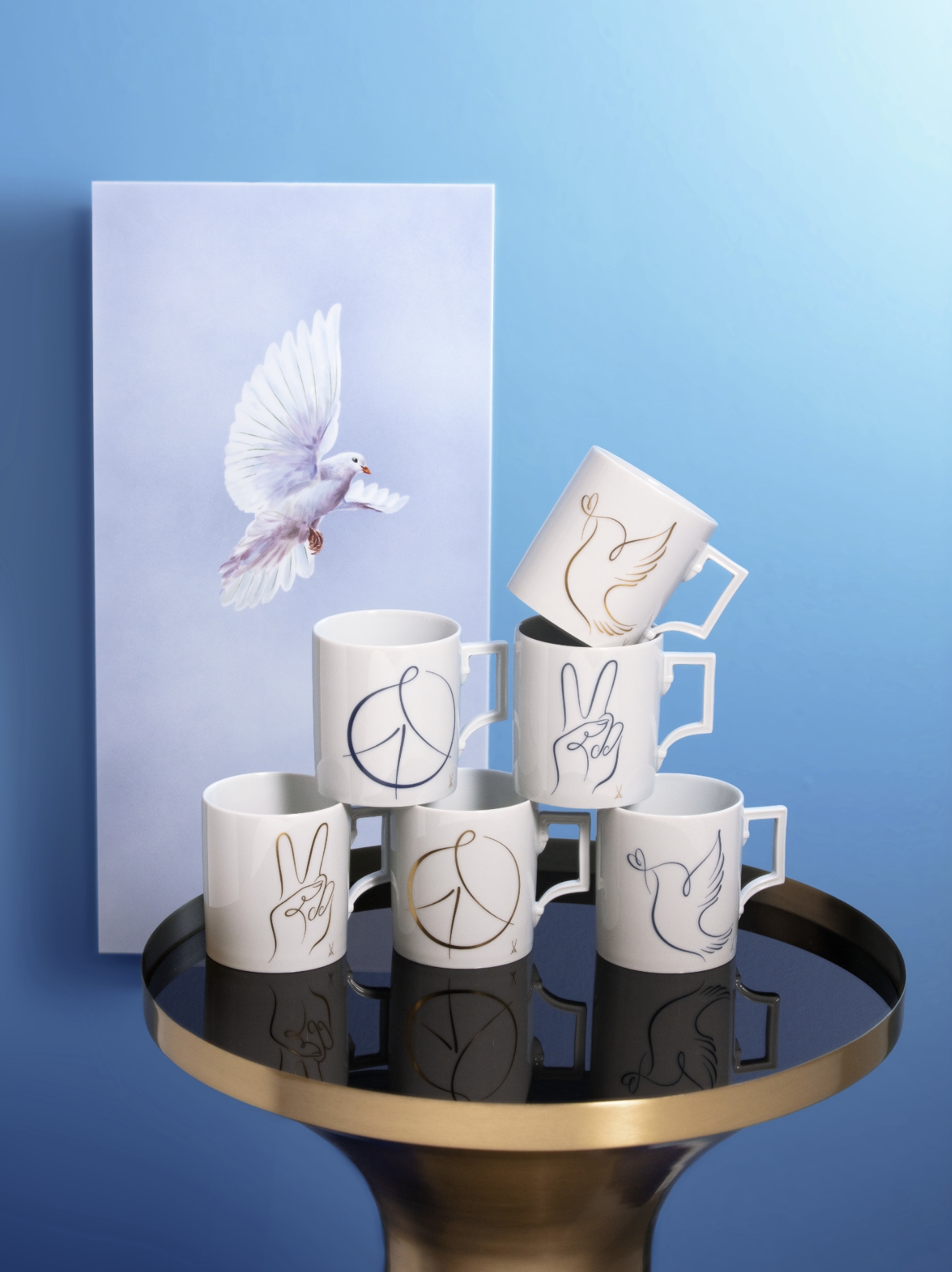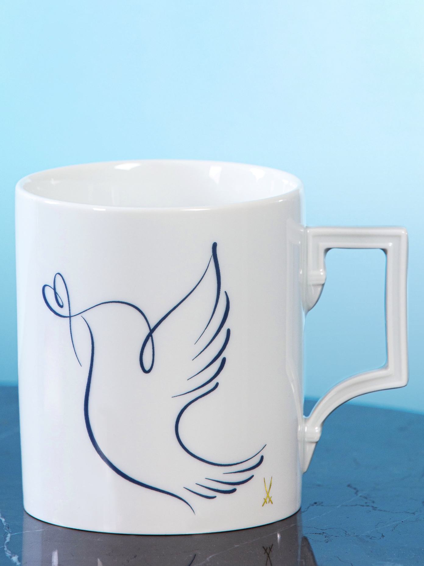 • We are deeply affected and shocked by the suffering and despair that people are currently experiencing due to the war in Ukraine. We want to show our solidarity with the people in Ukraine and have decided to actively support them. In a very short time, our highly talented trainees have developed various peace symbols that are suitable as porcelain decorations. From the many variants, we chose three peace symbols. We display these in blue and gold on our popular mugs. They set the sign that we stand up for peace and stand by the people of the Ukraine. We will donate 20% of the proceeds from the sale of these mugs to the "Emergency Ukraine" relief campaign of the "German Red Cross". Our hand-painted wall painting "Peace Dove" symbolises peace and will also be part of the fundraising campaign. Here also 20% of the proceeds of all sold wall paintings will go to the "Emergency Ukraine" relief campaign of the "German Red Cross".